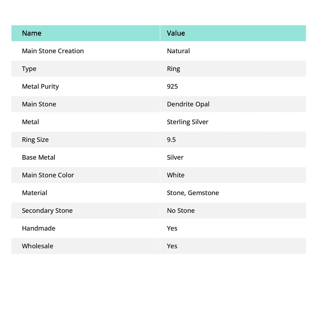 Handmade: Yes Gemstone Clarity Grade: Eye Clean Weight: 8.4 gm Main Stone Treatment: Not Enhanced Secondary Stone: No Stone Setting Style: Channel-Set Wholesale: Yes Theme: Beauty, Beach, Family & Friends, Love Era: Undated Country of Origin: India Main Stone Shape: Same As Picture Number of Diamonds: 0 Type: Ring Country/Region of Manufacture: India Occasion: Anniversary, Birthday, Christmas, Engagement, Valentine's Day, Wedding, Mother's Day Main Stone: Dendrite Opal Collection: Brand New Colored Diamond Intensity: Not Applicable Material: Stone, Gemstone Main Stone Size: 16X27mm Sizable: No Stone-Size: 16X27mm Metal: Sterling Silver Signed: Yes Shape: Same As Picture Customized: No UPC: Does Not apply Cut Grade: Fair Total Carat Weight: 50 Carat Above Color: White Band Width: 2 mm Diamond Color Grade: Not Applicable Brand: Unbranded Number of Gemstones: 1 ProductName: Ring Main Stone Creation: Natural Features: Adjustable, Engraved, Stackable Main Stone Color: White Diamond Clarity Grade: Not Applicable Certification: Yes Metal Purity: 925 Base Metal: Silver gtin13: Does Not apply Style: Band, Charm Ring Size: 9.5