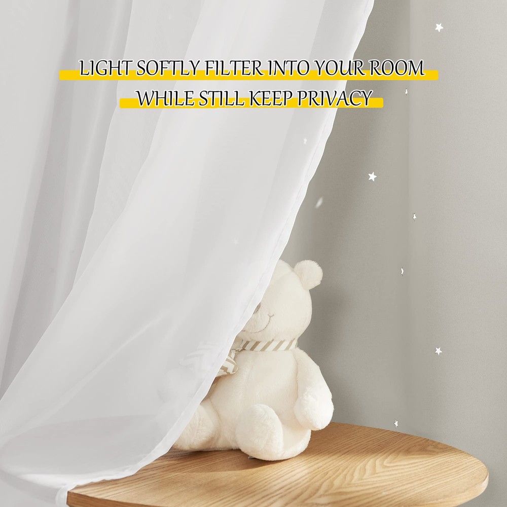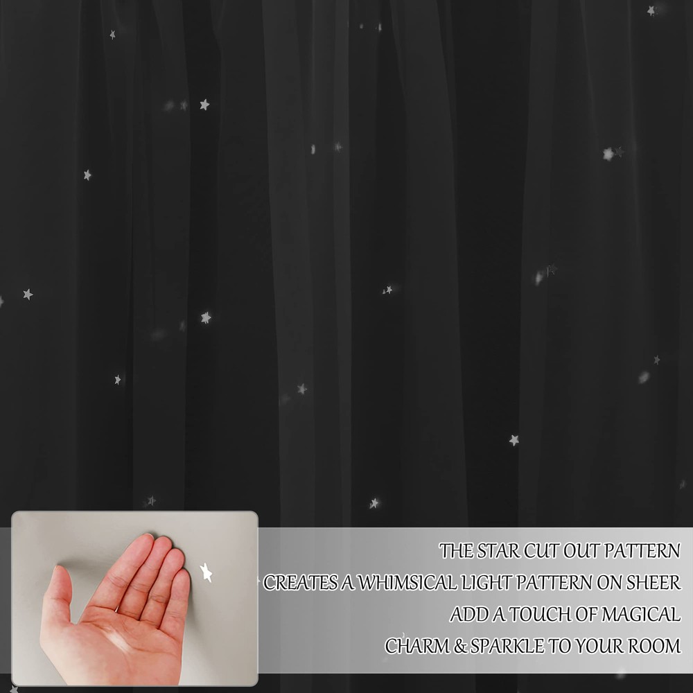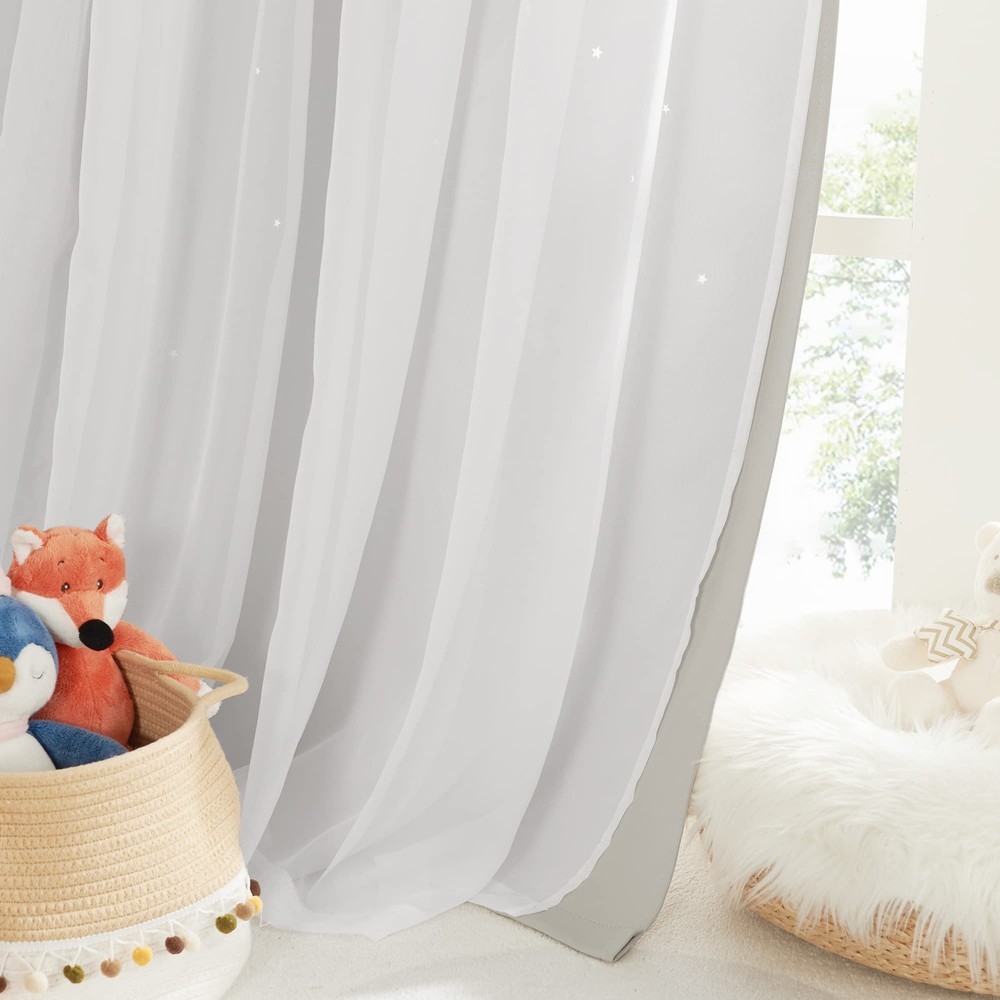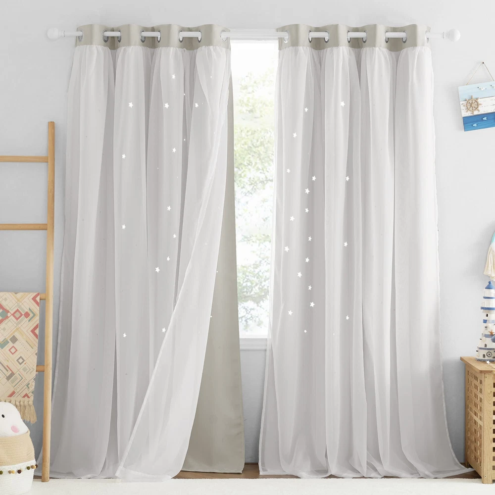 Detail Info: Package includes 2 pieces kids star curtains and 2 sheer tiebacks and 2 blackout tiebacks. Grommets top(1.6-inch inner diameter) curtain measures 52" wide per panel. Available length include 63", 72", 84", 95". Hollow Star: Hollow stars design cuts the light entering the room into the star shapes. The stars twinkle with the changing light throughout the day. This special airy sheer design will create a more dreamy sense for your little kids' room. Double Layer: White voile layer covered with blackout curtain features a dreamy elegant and romantic look to light up any home decor. Blackout fabric provides room for enough darkness and privacy to sleep, while the sheer panel brings an airy look. Best Gift: Design for kids and babies, the fabrics have NO chemical coatings or foil printing. We provide safe window decorations for your sweet little cuties. Blackout fabrics block the lightest promises you a nice sleep. Easy Care: The blackout curtains with sheer are made to last. Machine washable in cold water, tumble dry. Quick ironing or steam clean when needed.