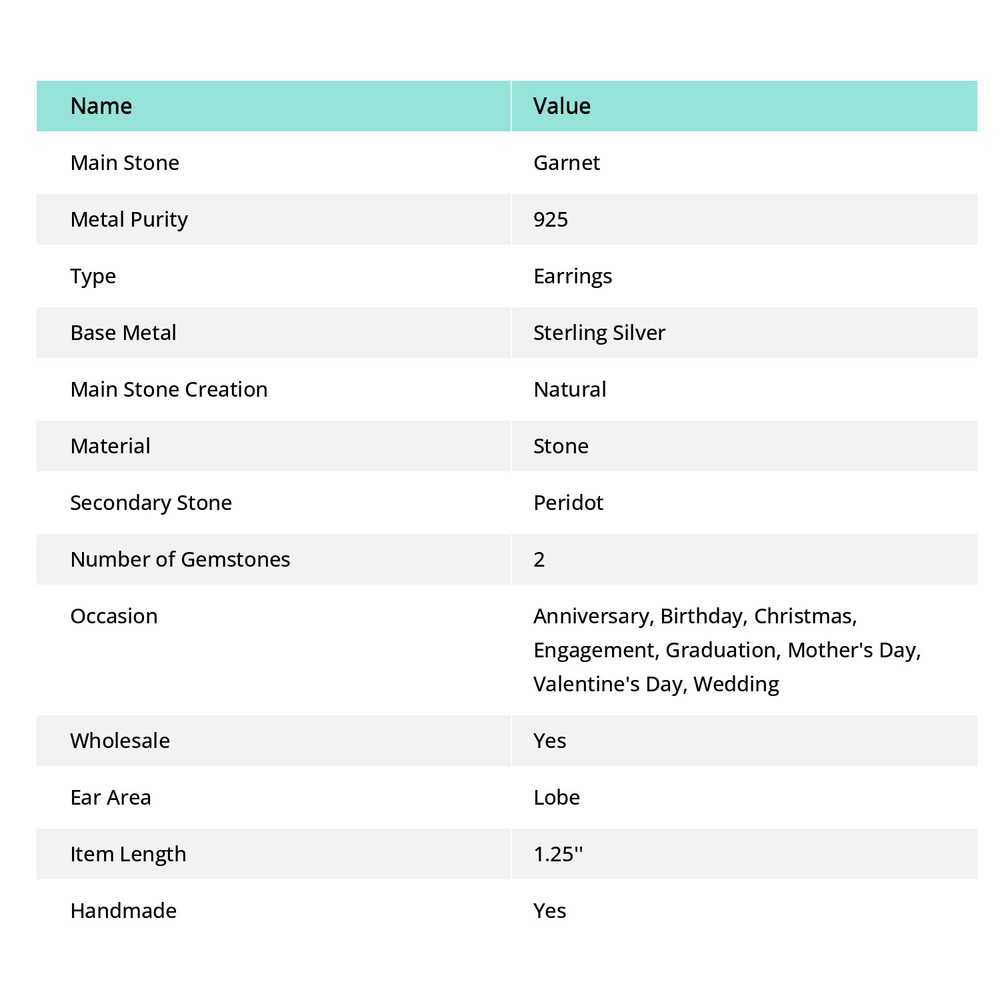 Number of Gemstones: 2 Certification: Yes Cut Grade: Fair Main Stone Treatment: Not Enhanced gtin13: does not apply Metal: Sterling Silver Brand: Unbranded Vintage: No Metal Purity: 925 Main Stone Creation: Natural Colored Diamond Intensity: Not Applicable Main Stone Shape: Same As Picture Features: Engraved Gemstone Clarity Grade: Eye Clean Handmade: Yes Country/Region of Manufacture: India Era: Undated Total Carat Weight: 50 Carat Above Shape: Same As Picture Signed: Yes Item Length: 1.25'' UPC: does not apply Main Stone: Garnet Color: Red Type: Earrings Theme: Art, Beach, Beauty, Family & Friends, Love, Luck Occasion: Anniversary, Birthday, Christmas, Engagement, Graduation, Mother's Day, Valentine's Day, Wedding Closure: French Wire Material: Stone Fastening: Fish Hook Setting Style: Channel-Set Secondary Stone: Peridot Wholesale: Yes Diamond Color Grade: Not Applicable Diamond Clarity Grade: Not Applicable Country of Origin: India Main Stone Color: Red Style: Drop/Dangle Ear Area: Lobe Number of Diamonds: 0 Base Metal: Sterling Silver Weight: 3.2 gm