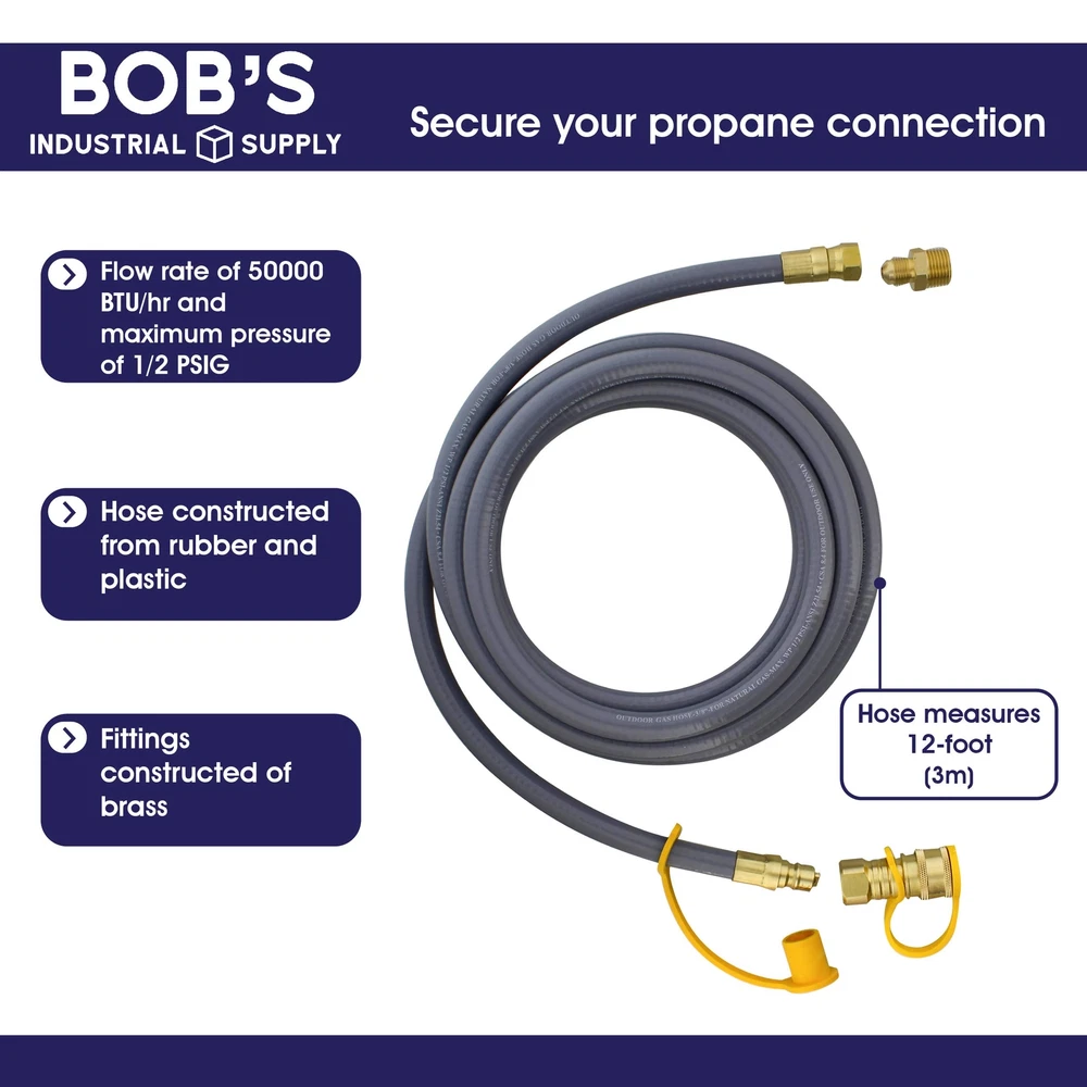 Use the BISupply Grill Natural Gas Converter Propane Quick Connect Hose 12ft Hose for fueling machinery, vehicles, and more for your warehouse and jobsite. Natural gas quick release hose allows you to convert natural gas into propane. Fittings for your gas quick connect hose are constructed of brass to withstand repeated, extended use, and the hose is 12 feet long and made of rubber and plastic. Grill natural gas line has a flow rate of 50000 BTU/hr and a maximum pressure capacity of 1/2 PSIG. Natural gas grill hose quick connect hose features 3/8in quick disconnect plug, 5/8in-18 UNF connection, 3/8in female flare to 3/8in male flare brass adapter. Attach hose to large volume low pressure tanks. This is not designed for air pressure. Coupling required for conversion, not included. Warning: This product can expose you to chemicals which is [are] known to the State of California to cause cancer and birth defects or other reproductive harm. [Secure Your Propane Connection]: Use the BISupply Gas Line Quick Connect Gas Hose 12-Foot Hose for fueling machinery, vehicles, and more; Depend on this natural gas conversion kit for converting natural gas to propane; Coupling required for conversion, not included [Built to Last]: No need to worry about this natural gas quick connect hose and parts cracking under the pressure; Fittings for your gas quick connect hose are constructed of brass to withstand repeated, extended use; Hose is 12 feet long (3m) and made of rubber and plastic [Convert the Flow]: Grill natural gas line has a flow rate of 50000 BTU/hr and a maximum pressure capacity of 1/2 PSIG; With an inner diameter of 3/8-inch (1cm), this natural gas to propane quick connection hose is made for larger tanks and applications; Use for low pressure gas tanks [Connect the Correct Specs]: Natural gas grill hose quick connect hose features 3/8in (1cm) quick disconnect plug, 5/8in (1.5cm) 18 UNF connection, 3/8in (1cm) female flare to 3/8in (1cm) male flare brass adapter; Includes dust cap and plug for each fitting [For Your Warehouse Needs]: Use this natural gas flexible hose for your warehouse machinery and vehicles; Fuel up your forklifts, vans, trucks, heaters, and other applications by converting natural gas into propane; Not designed for air pressure