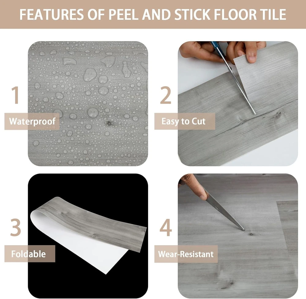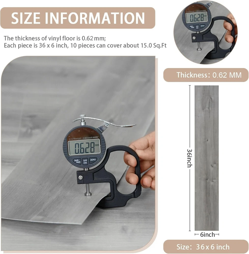 Item Form: Sheet Number in Pack: 10 Item Dimensions: 36 X 6 X 0.03 Inches Grade Rating: Residential Color: Gray Item Weight: 2.25 lb Item Height: 0.03 Inches Features: Waterproof, Self Adhesive, Wear-Resistant, Heat Resistant, Non-Slip Surface Design gtin13: Does Not Apply Tile Size: 6 x 36 in Material: PVC Finish: Natural Shape: Rectangular Item Dimensions L X W X H: 36 X 6 X 0.03 Inches Style: Modern Grade: Grade 1 Unit Count: 14.5 Square Feet Room: Bathroom, Kitchen, Living Room, Bedroom, Laundry Room, RV Item Thickness: 0.62 mm Suitable For: Residential, Indoor Tile Surface Texture: Smooth Tile Shape: Rectangle Series: Peel and Stick Floor Tile UPC: Does Not Apply Edge Design: Straight Edge Item Shape: Rectangular Brand: Unbranded Installation: Peel-and-Stick Type: Floor Tile Coverage per Case: 15 ft²