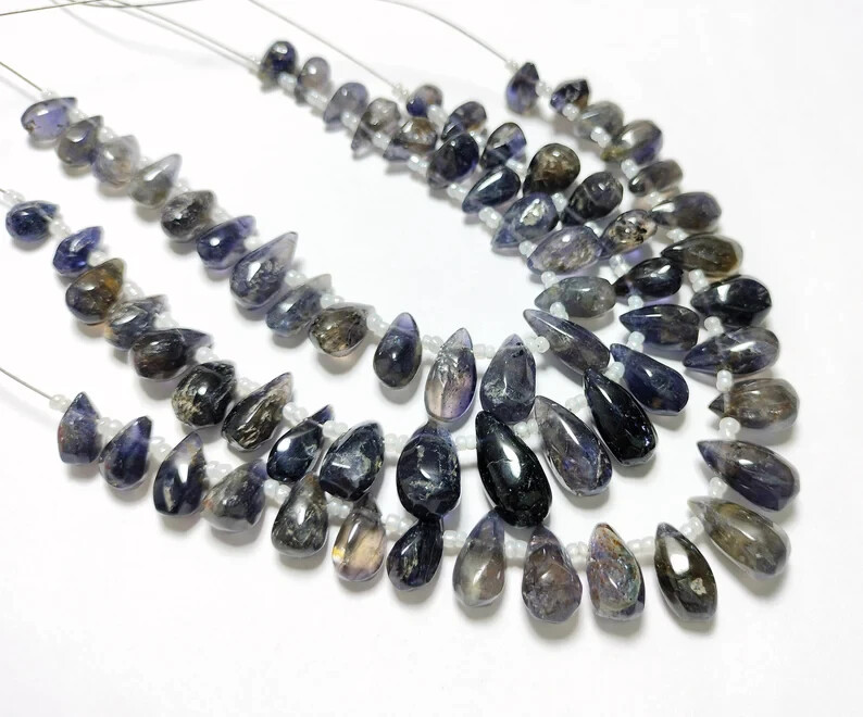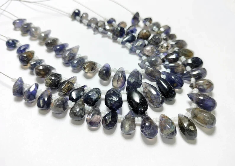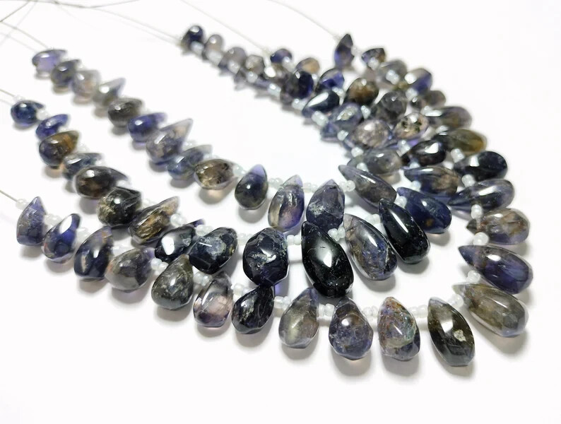 This product is a 7" strand of smooth teardrop Iolite beads, ranging in size from 5x8 to 8x17mm. The beads are handmade from glossy blue gemstone material, creating a stunning and unique addition to any jewelry making project. Super Finest Quality 100% Natural Iolite Gemstones Beads Shape------Smooth, Teardrop Beads. Size------- 5X8 To 8X17 mm Approx Length----- 7"Inch Strand Quantity---- 1 Strand