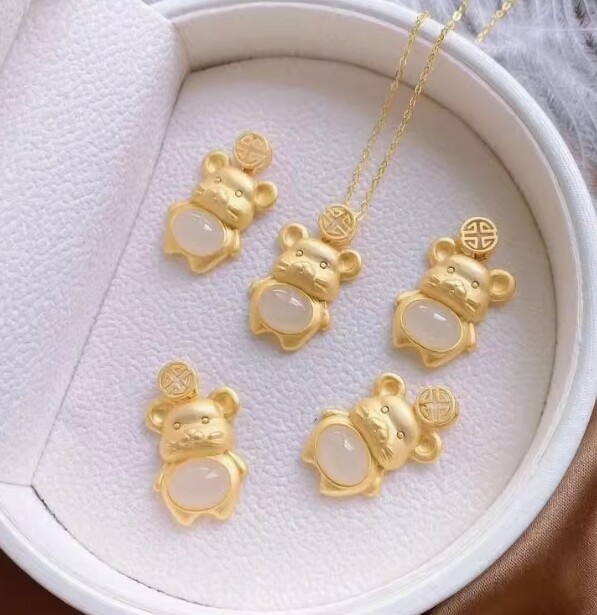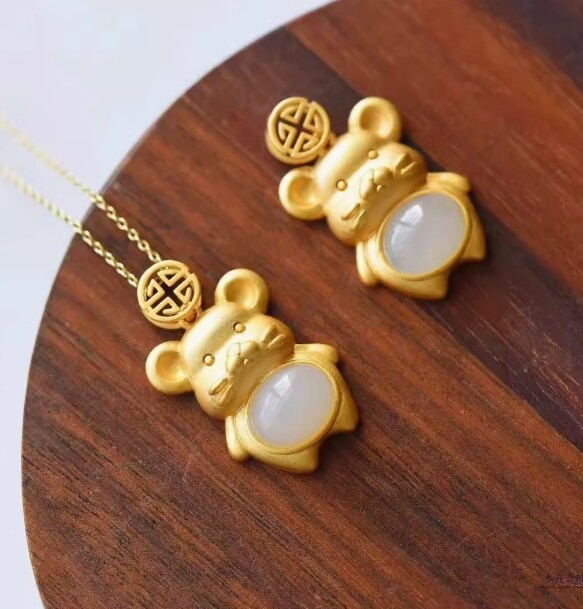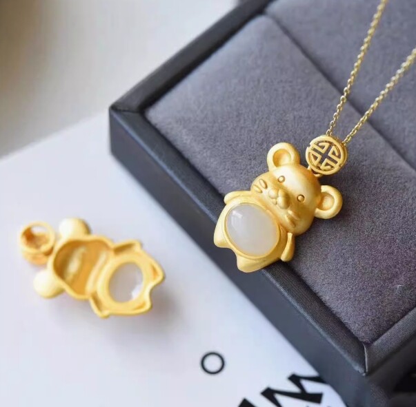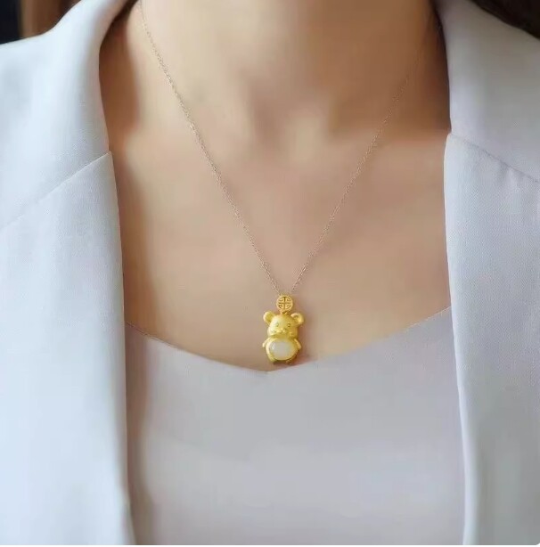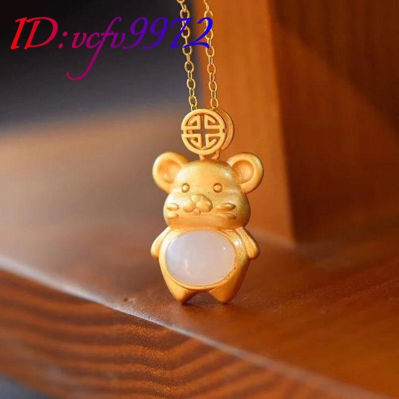 Natural Jade Mouse Pendant Necklace Real Jewelry Charm 18K Gold Plated Amulet