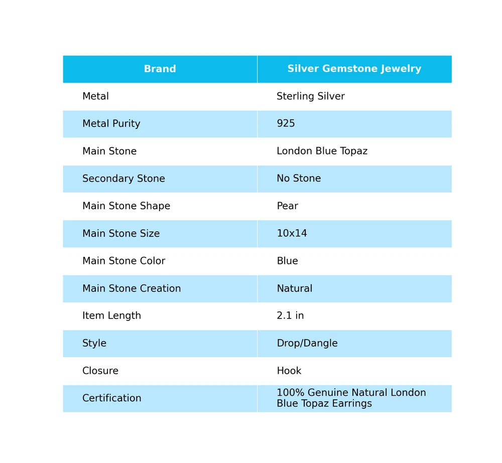 Welcome to Jaipur Silver Gallery Natural London Blue Topaz Gemstone Drop/Dangle Earrings 925 Sterling Silver Handmade Earrings, Sterling Silver Earrings, LONDON BLUE TOPAZ Earrings, Handcrafted Earrings SKU : - JSEE-37-5 Gemstone : - LONDON BLUE TOPAZ Stone Shape : - Pear Metal : - Sterling Silver Metal Purity : - 925 Earring Length : 2.1 Inches Earring Width : Inches _______________________________________________________________________________________ Amazing Properties of Silver ****************************** Tough and Long-lasting: Silver is incredibly strong, built to withstand daily wear and tear as well as tough environmental conditions. Easy to Shape and Design: Silver is like clay for skilled craftsmen, allowing them to create beautiful and intricate designs effortlessly. Great at Conducting Energy: When it comes to heat and electricity, silver is the go-to. It can quickly and efficiently transfer energy, making it ideal for various applications. Keeps Things Clean and Safe: Silver has a natural ability to keep harmful bacteria at bay, making it a reliable choice for promoting cleanliness and well-being. 3 Underrated Benefits Of Silver ****************************** Gorgeous Charm: Silver jewelry shines brightly, enhancing any outfit and fitting everyone's style with ease. Gentle on Skin: Silver is kind to your skin, reducing the chance of allergies and making it a favorite choice for accessories. Healing Vibes: Some believe silver jewelry has a soothing touch, possibly aiding in easing issues like arthritis, anxiety, and the blues. _______________________________________________________________________________________ For Mother's Day Gift For Father's Day Gift For Promise For Valentine' Day For Halloween Party For Christmas Day Gift For New Year Party For Mom For Her _______________________________________________________________________________________ If you need more help or want design tips, just give us a shout! We're lightning-fast in getting back to you. Every single thing we create is made by hand in our special workshop, and we put a whole lot of love and care into every piece. Thank you for stopping by! We're confident you'll have an amazing time shopping with us. We're here to make sure every moment you spend with us is filled with delight and satisfaction. Happy shopping!