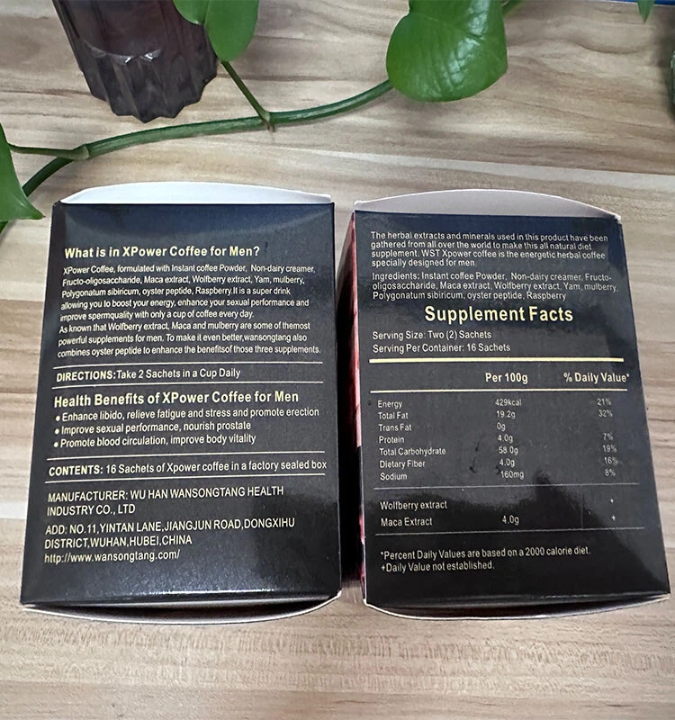 Taste:NeutralTheme:Energy DrinksInstruction for use:Take 2 sachets a day.Date of Creation:C-TS3080Color:BlackSpecification:10g*20 bags/BoxCountry/Region of Manufacture:UnknownOriginal/Reproduction:OriginalBrand:UnbrandedStorage Type:Place in a cool,dry and ventilated placeContent:PowderProduct name:X power coffee for manType of Advertising:Enlargement Instant Herba Power CoffeePackaging:Box