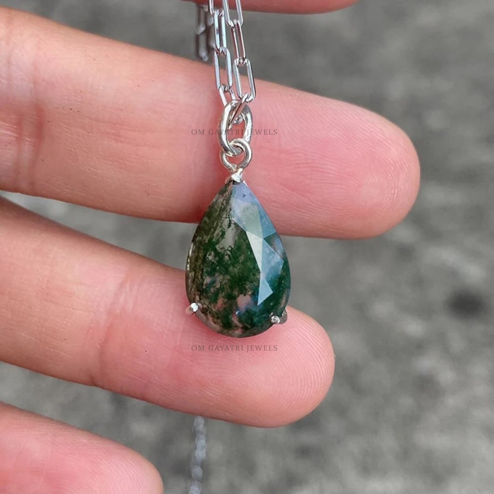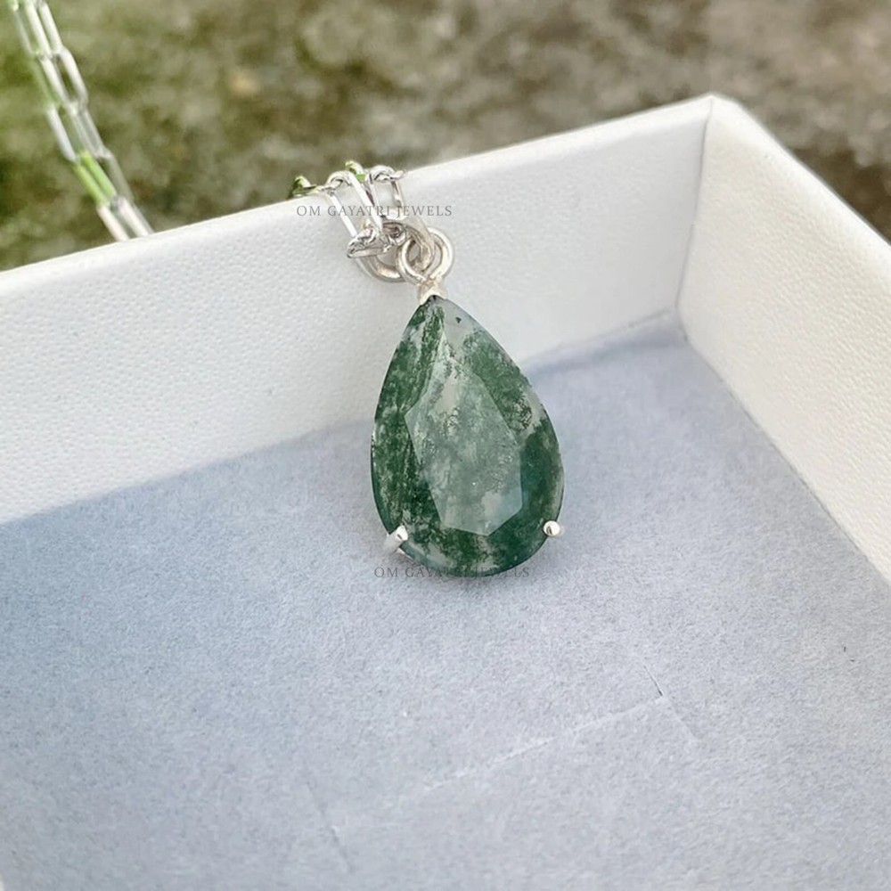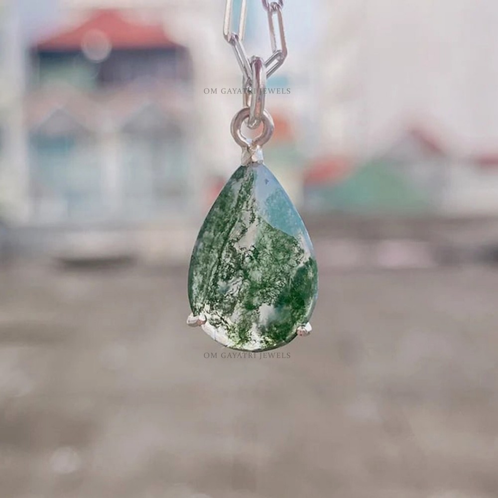 Add a touch of natural beauty to your outfit with this stunning handmade pendant. The pendant features a natural pear-shaped moss agate gemstone, set in a 925 sterling silver charm locket. The gemstone has a beautiful eye-clean clarity grade and a excellent cut grade. The pendant has a hook closure and is perfect for any occasion, including engagements, Mother's Day, Christmas, anniversaries, and birthdays. This pendant is a unique and personalized piece of jewelry that will make a great addition to any collection. It is nickel-free and has no antique or vintage features. The pendant was made in India and has a beautiful green color that will complement any outfit. The seller provides a warranty for this piece of jewelry, which is customized and perfect for those who appreciate nature and beauty. Natural Pear Moss Agate Pendant 925 Sterling Silver Handmade Gemstone Jewelry Gemstone: Moss Agate Stone Size: 9x12mm Stone Shape: Pear Stone Category: Faceted Metal: 925 Sterling Silver Please Note :- Chain is not included with Pendant