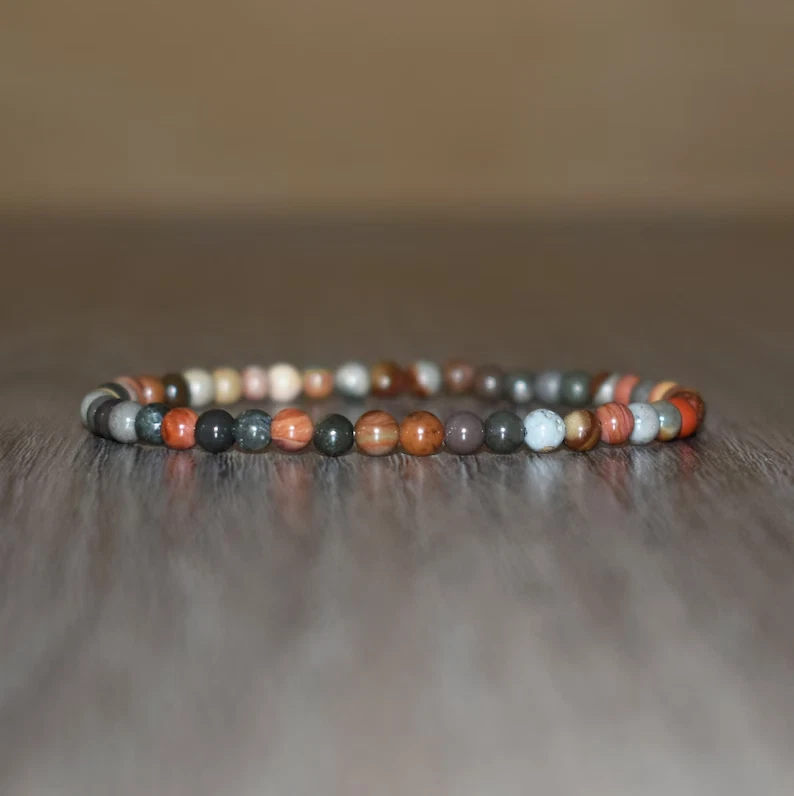 Materials: Ocean Jasper •Product Type: Bracelet •Length: Around 6.7 inches, will fit a 6.5 in to 7.5 in wrist supports through times of stress and brings tranquility and wholeness - brings deep-rooted and unresolved emotional issues to the surface and uses its gentle energy to heal them - supports the Heart Chakra - helps to find inner peace, clarity, emotional healing, love and compassion - encourages honesty with self Note: Each order comes with only 1 bracelet even though you may see pictures with multiple bracelets shown.