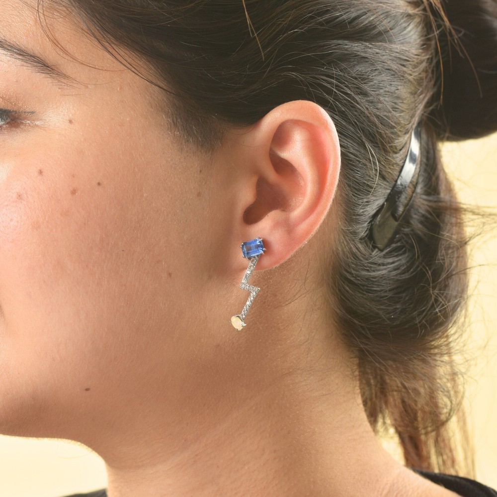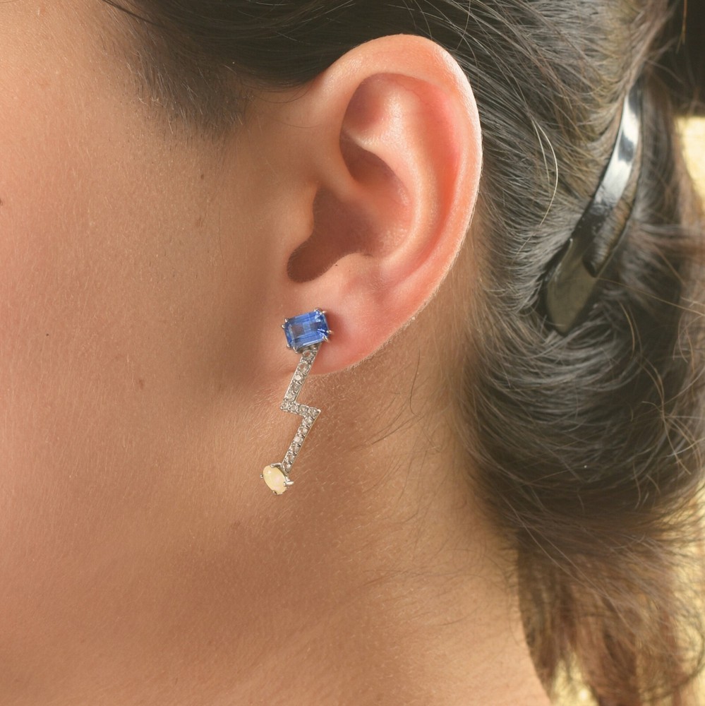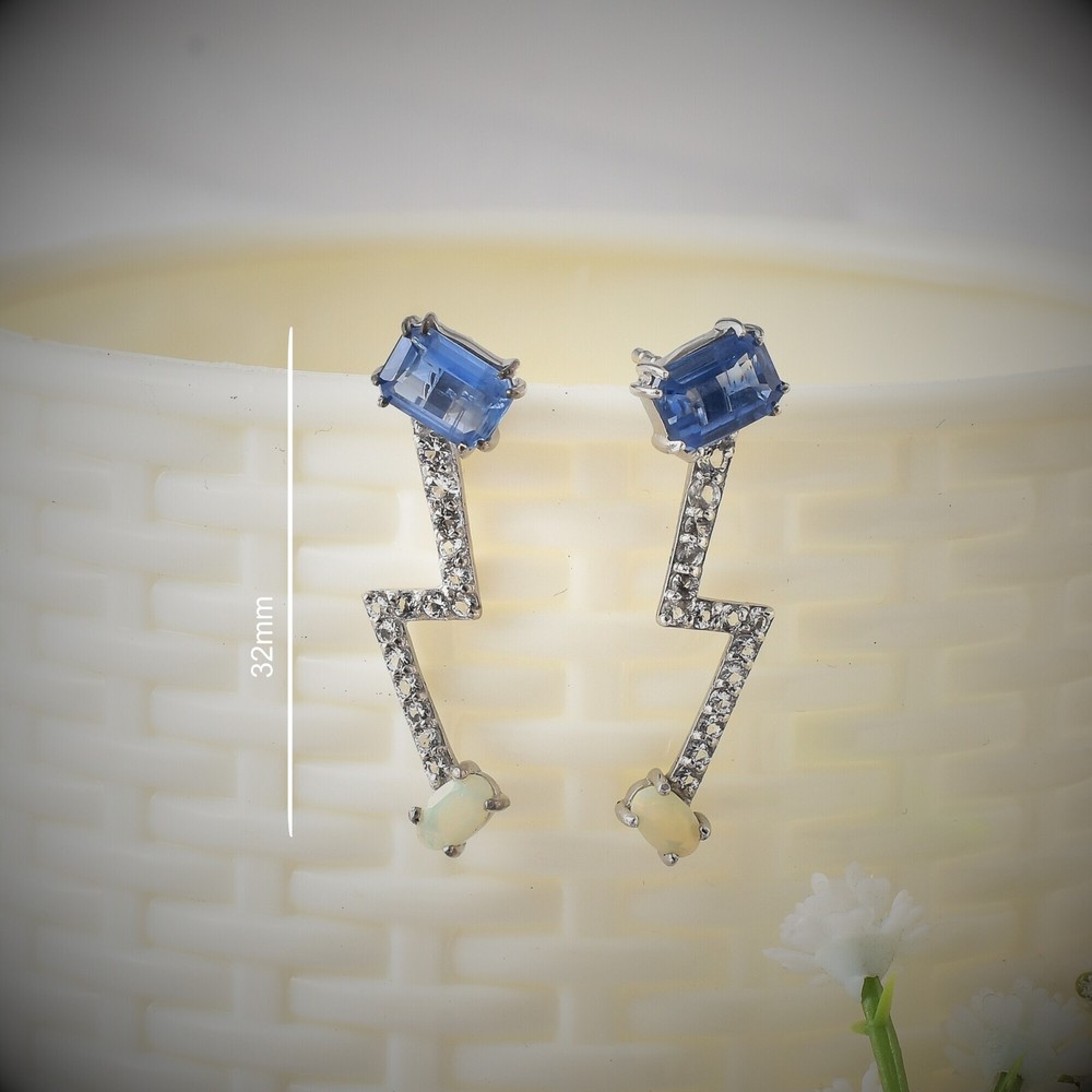 Add a touch of elegance to your outfit with these beautiful NATURAL OPAL & BLUE KYANITE RHODIUM PLATTED 925 SILVER EARRINGS. The earrings are delicately crafted with fine silver and feature a prong setting style with two gemstones, a blue kyanite and a white opal. The earrings are eye-catching and will make a great addition to any jewelry collection. These earrings are perfect for any occasion, whether it's an engagement, wedding, anniversary, graduation, or just to say "I love you" to your loved one. They are nickel-free and stackable, with a length to fit any ear size. The earrings are also personalized with your name or a special message of your choice. Order now and add a touch of beauty and nature to your jewelry collection.