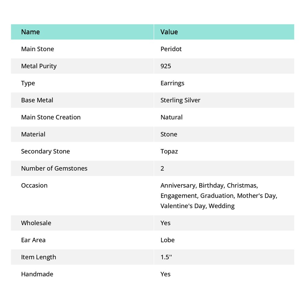 Diamond Color Grade: Not Applicable Handmade: Yes Metal Purity: 925 Item Length: 1.5'' Theme: Art, Beach, Beauty, Family & Friends, Love, Luck Main Stone: Peridot Wholesale: Yes Setting Style: Channel-Set Main Stone Treatment: Not Enhanced Era: Undated Diamond Clarity Grade: Not Applicable Style: Drop/Dangle Closure: French Wire Vintage: No Type: Earrings Total Carat Weight: 50 Carat Above Country/Region of Manufacture: India Main Stone Color: Green Certification: Yes Main Stone Creation: Natural Color: Green Base Metal: Sterling Silver Colored Diamond Intensity: Not Applicable gtin13: does not apply Main Stone Shape: Same As Picture Shape: Same As Picture Material: Stone Secondary Stone: Topaz Gemstone Clarity Grade: Eye Clean Weight: 2.6 gm UPC: does not apply Cut Grade: Fair Signed: Yes Occasion: Anniversary, Birthday, Christmas, Engagement, Graduation, Mother's Day, Valentine's Day, Wedding Number of Diamonds: 0 Ear Area: Lobe Brand: Unbranded Number of Gemstones: 2 Fastening: Fish Hook Country of Origin: India Features: Engraved Metal: Sterling Silver