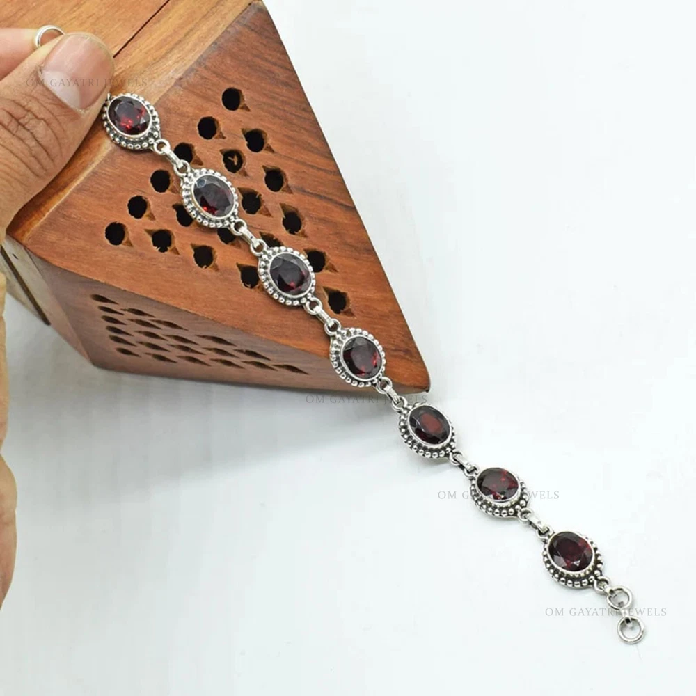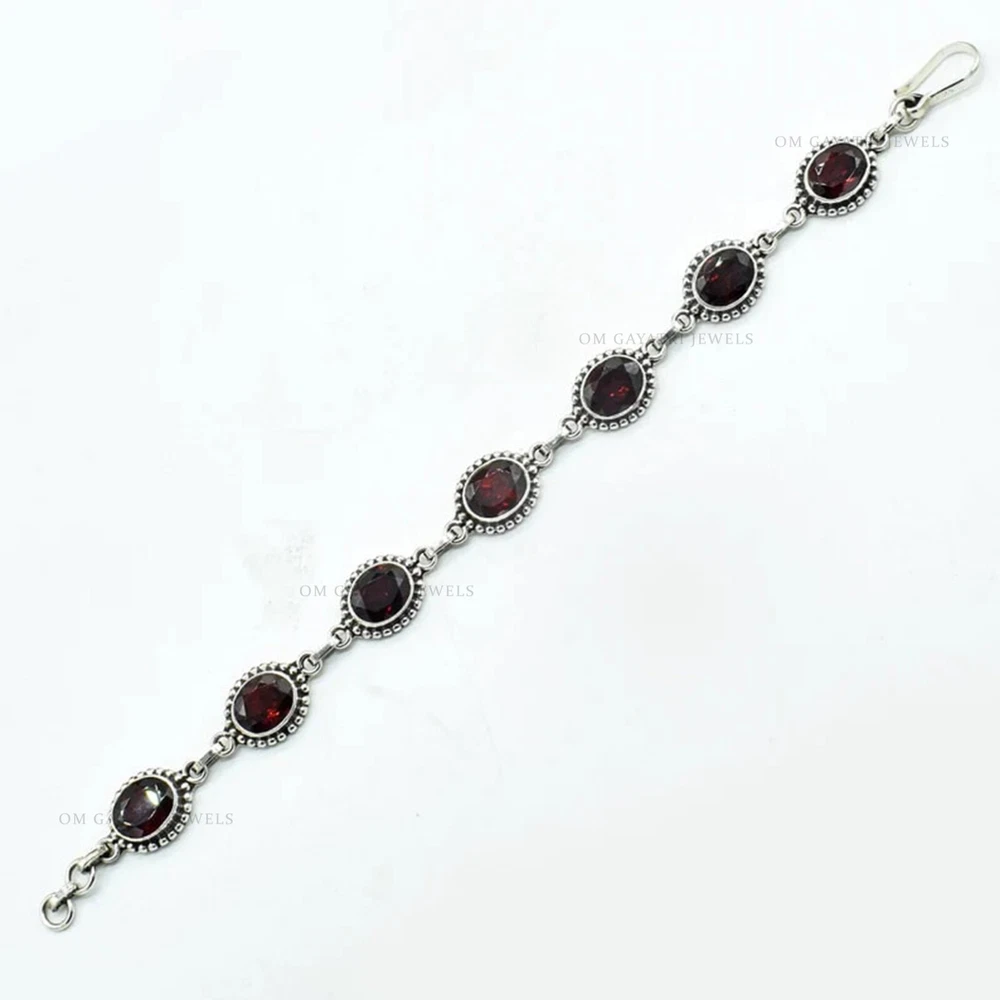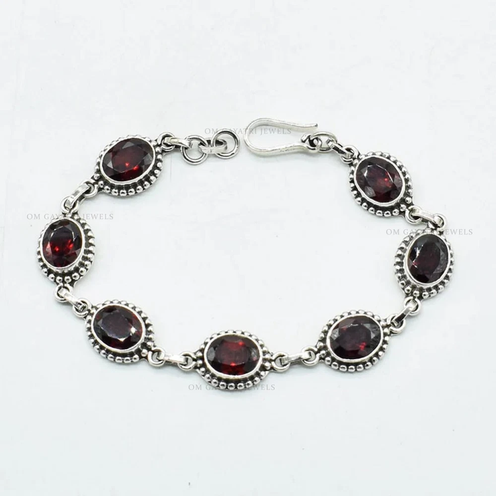 Add a touch of elegance to your outfit with this stunning handmade bracelet. Crafted from 925 sterling silver, this bangle features a beautiful oval-shaped red garnet gemstone with a clarity grade of eye clean. The bracelet is adjustable and has a length of 7.5 inches, making it suitable for various occasions such as weddings, anniversaries, and birthdays. This vintage bracelet has a bezel setting style and a bar link chain type. It is also personalized and comes with a seller warranty. The bracelet is perfect for those who appreciate art deco era jewelry and nature-inspired themes. Don't miss out on the opportunity to own this exquisite piece of fashion jewelry. Natural Red Garnet Bracelet 925 Sterling Silver Handmade Bracelet Jewelry Item: Bracelet Gemstone: Garnet Stone Shape: Oval Stone Size: 6x8mm Stone Category: Faceted Metal: 925 Sterling Silver