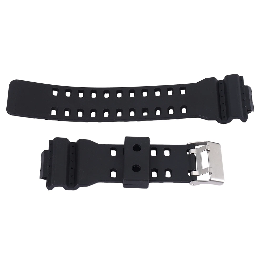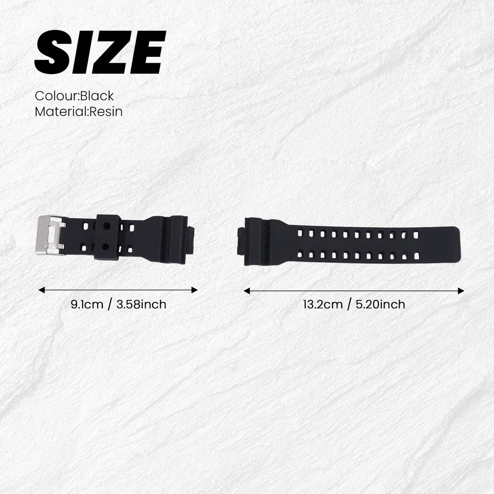 Natural Resin Replacement Watch Band Strap , for 2743 Fits for: G-8900/GLS-8900/GR-8900/GW-8900/GD-100/GD-110/GD-120/GA-110/100/120/200/GA-150/GLS-100/GA-300 and others. Made of nonallergenic waterproof natural resin. with anti-skid lines on the back. Make you feel light, sturdy, soft and flexible during your wear. With nonallergenic silver plated dull polish stainless steel buckle. Make your strap more durable than other straps that use a plastic buckle. excellent replacement. Let your watch look the same as. Colour:Black Material:Resin Size: long: 132mm, short: 91mm Package Contents: 1* Resin watch strap Only the above package content, other products are not included. Note: Light reflection and different displays may cause the color of the item in the picture a little different from the real thing. The measurement allowed error is +/- 1-3cm.