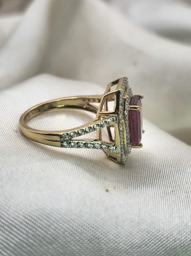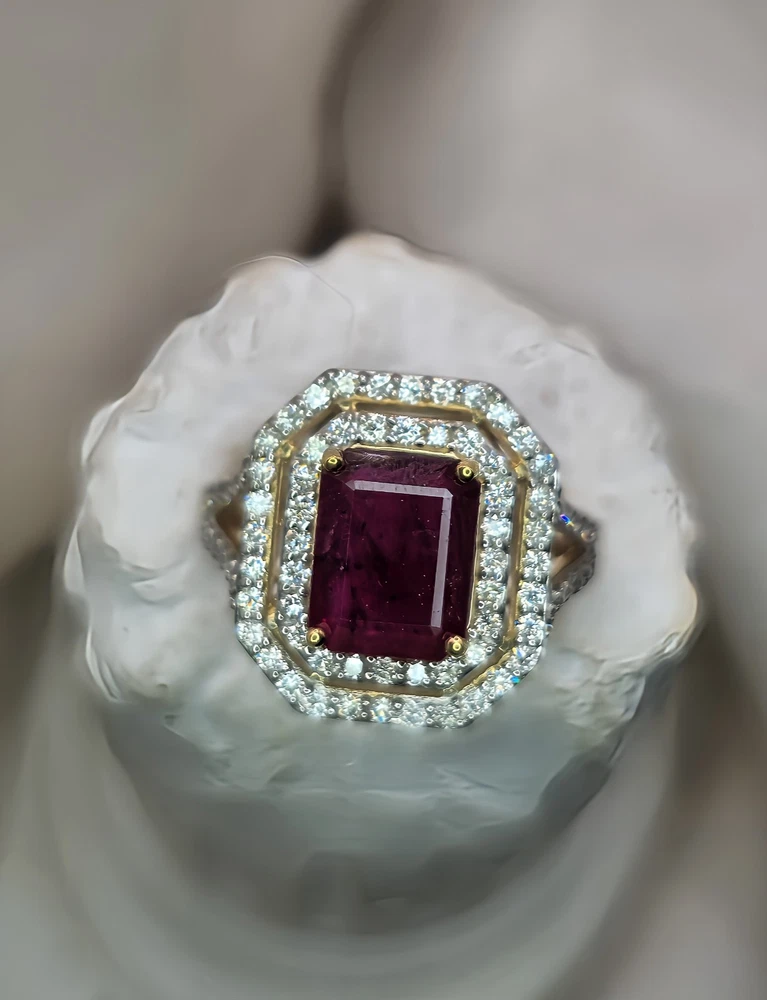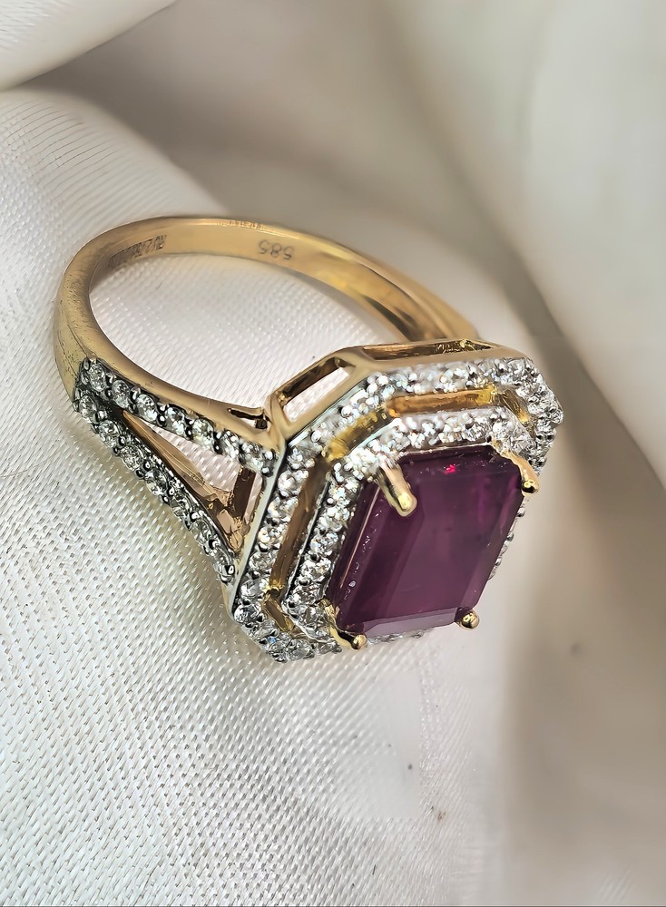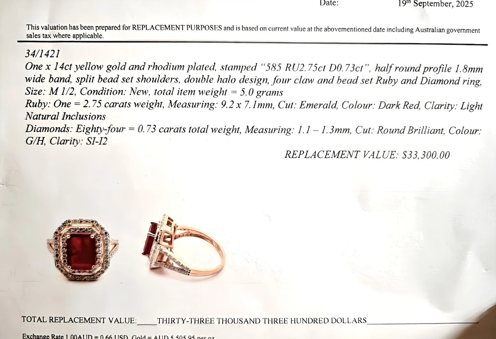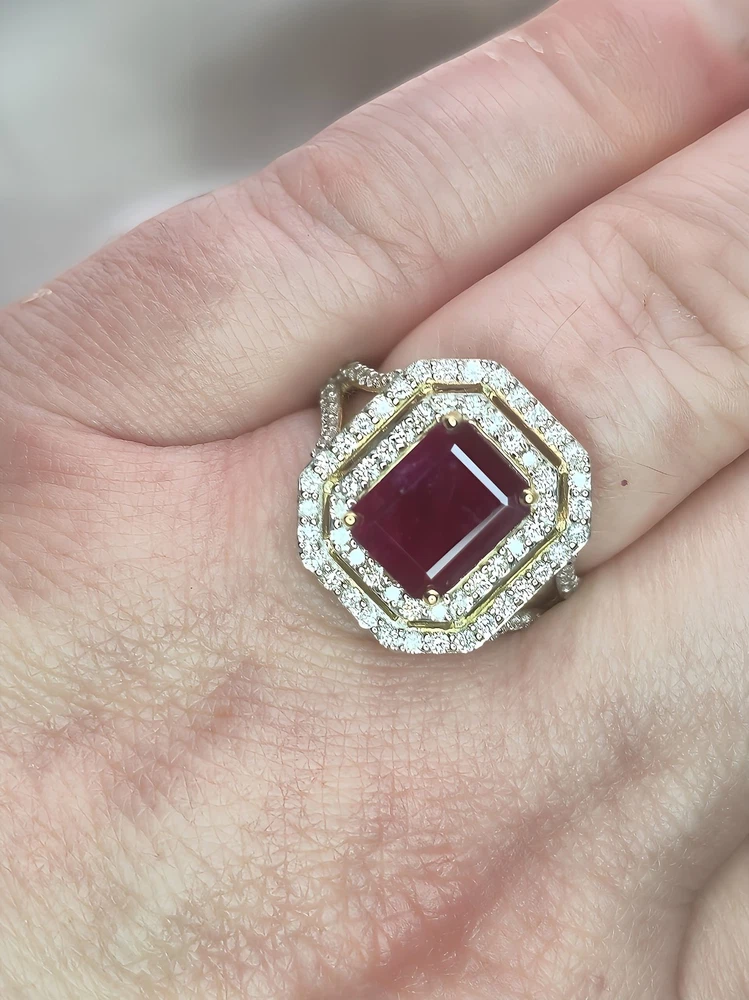 All pieces are directly from Manufacturing Wholesaler Brand New THE THE PHOENIX FIRE COLLECTION JULY BIRTHSTONE 40th ANNIVERSARY MOH SCALE: 9/10 DESCRIPTION Crafted in 14ct Yellow Gold and Featuring 1x Natural & Untreated Rich Red Ruby in an Emerald Cut & a Surrounded by a Gorgeous Fancy Double Halo of Natural White Diamonds in Round Brilliant Cuts. Weight: 5.00 grams Ring Size: M1/2 1x Natural & Untreated Ruby in an Emerald Cut Weighting a Total of 2.75ct White Round Brilliant Cut Diamonds Weighting a Total of .73cts Colour: G/H Clarity: Si - I1 A quick note on pricing: I source all my items through a much-loved local manufacturing wholesaler on consignment. To keep things fair for the maker, my discount power is limited. Please keep this in mind when making an offer—I’d love to find these pieces a home, but I need to honor the value set by my local supplier, thank you. ACCREDITATION Registered with the Nationally Recognised Governing Body of Australia to Ensure Industry Standards. All Valuers Are Nationally Registered Members of- - Australian Jewellery Valuers Guild - Jewellers Association of Australia (JAA) - Gemological Association of Australia Member (GAA) Independent Valuation Provided Retail Replacement Value $33,300.00 All Brand New Pieces Come With A 12 Month Manufacturing Warranty RUBY FACTS Rubies, known for their deep red color, are considered the stone of passion, vitality, and strength. Often referred to as the "king of gemstones," rubies are believed to enhance energy and provide protection against misfortune. They are thought to bring courage, boost confidence, and help in achieving one's goals. Like many gemstones, rubies are made under extreme heat and pressure below the earth. When compressed, oxygen and aluminum atoms turn into corundum. This mineral, along with the presence of chromium, creates rubies and their distinct hue. In Burma—a significant ruby source since at least 600 AD—warriors believed that rubies made them invincible. They even implanted rubies into their skin to grant protection in battle. Burmese rubies are still some of the most prized of all ruby gems.