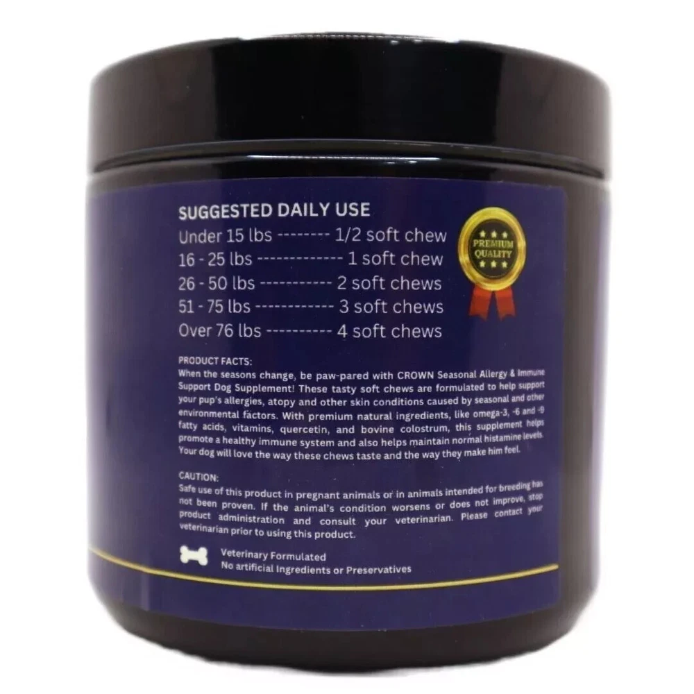 PRODUCT DESCRIPTION When the seasons change, be paw-pared with Crown Dermacare Seasonal Allergy & Immune Support Dog Supplement! These tasty soft chews are formulated to help support your pup’s allergies, atopy and other skin conditions caused by seasonal and other environmental factors. With premium natural ingredients, like omega-3, -6 and -9 fatty acids, vitamins, quercetin, and bovine colostrum, this supplement helps promote a healthy immune system and also helps maintain normal histamine levels. Your dog will love the way these chews taste and the way they make him feel! DIRECTION FOR USE Give recommended amount once daily. When starting, give 1/2 the recommended amount for the first 5-7 days to allow your pet to adjust to the soft chews. For use in dogs over 12 weeks of age. STORAGE Store in a cool, dry place. For best results, refrigerate after opening. SIZE 90 Soft Chews