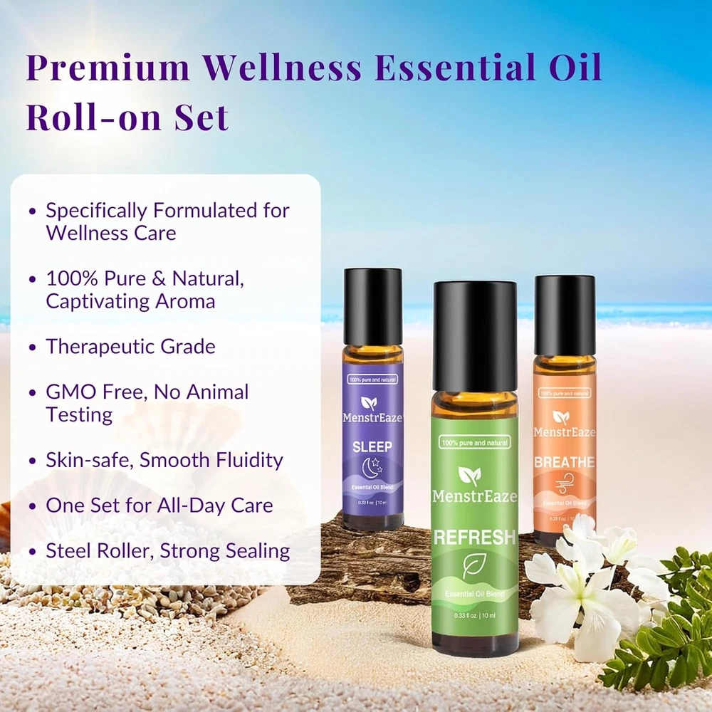Store New Arrivals Add to Favorite View Feedback Contact Therapeutic Grade Essential Oils Roll-On Set (Refresh, Breathe, Sleep), Natural Energy Boost, Head Comfort, Deep Relaxation, Sleep Support, Clear Breathing, Self-Care Gift, 3X10Ml Description Style Wellness Set Special Feature function(f) {var _np=(window.P._namespace("DetailPageProductOverviewTemplatesJava"));if(_np.guardFatal){_np.guardFatal(f)(_np);}else{f(_np);}}(function(P) { P.when('A').execute(function(A){ A.on('a:truncate:po-attribute-truncate-2:updated', function(data) { var isTruncated = !data.truncateInstance.getIfTextFits(); var seeMoreElement = document.getElementById('po-attribute-see-more-id-2'); if(seeMoreElement) { seeMoreElement.style.display = isTruncated ? '' : 'none'; } }) }); })); Heartfelt Gift for Health, All Day Support, Stress Relief Gift for Men & Women, 100% Pure and Nature See more Brand MenstrEaze Product Benefits Sleep Support, Respiratory Support, Headache & Sinus Relief Seasons All Seasons Scent Eucalyptus, Lavender, Peppermint, Lemon Package Dimensions 4.92 x 4.61 x 0.94 inches; 4.97 ounces Manufacturer MenstrEaze PREMIUM THERAPEUTIC GRADE ESSENTIAL OIL ROLL-ON SET: Our MenstrEaze Premium Wellness Set features 100% pure, all-natural, therapeutic grade essential oils, steam-extracted directly from the finest botanical sources. Free from GMOs, parabens, SLS, petroleum, mineral oil, artificial colors, and preservatives, this roll-on essential oil set is carefully crafted to provide a safe, effective, and indulgent aromatherapy experience. Thoughtfully blended with carrier oils, these therapeutic-grade essential oils are designed to offer all-day support for sleep, breathing, and head comfort, making them the perfect choice for self-care gifts. REFRESH FOR HEAD COMFORT: Experience soothing relief from head tension and sinus discomfort with our REFRESH blend. Infused with peppermint, wintergreen, camphor, and eucalyptus globulus essential oils, this minty and invigorating scent provides cooling and muscle relaxation. It’s the perfect companion for easing sinus and head discomfort, offering stress relief gifts for women who value self-care and wellness. Apply this essential oil roll on for a burst of freshness that revitalizes and uplifts your mind. BREATHE FOR RESPIRATORY SUPPORT: Our BREATH blend features a sweet and fresh aroma, enriched with lemon, tea tree, and peppermint essential oils. Specifically formulated to support respiratory health, this blend helps relieve colds, coughs, and congestion, making it an essential part of your daily wellness routine. Use this organic essential oil set to create a soothing and breathable environment, promoting comfort and relaxation for a clearer, healthier you. SLEEP FOR DEEP RELAXATION: Wind down and embrace a restful night’s sleep with our SLEEP blend. Infused with the calming and soft scent of lavender essential oil, this blend promotes deep relaxation, making it one of the most cherished self-care items for women. This sleep essential oil roller creates a tranquil bedtime atmosphere, ideal for unwinding and achieving a peaceful, restorative sleep. Perfect as stress relief gifts for women, it soothes your senses and prepares you for serene slumber. DIRECT APPLICATION FOR CONVENIENCE: Our essential oil roll on set is pre-diluted with natural carrier oils, making it ready for direct use on your skin. With a stainless steel rollerball, you can enjoy the refreshing, cooling, and gentle pressure sensation while ensuring optimal oil flow and leak-resistant application. Apply to your wrists, chest, temples, palms, soles, or behind the ears to enjoy aromatherapy anywhere, anytime. The compact size makes it easy to carry and use for on-the-go relaxation. HEALTH AS A GIFT: MenstrEaze Premium Wellness Set is the ideal choice for stress relief gifts and self-care items for women. Thoughtfully packaged and perfect for special occasions like Valentine’s Day, anniversaries, housewarmings, Christmas, or birthdays, these women gifts embody the essence of health and wellness. Give the gift of aromatherapy with our organic essential oil set, and show your loved ones you care about their well-being and peace of mind. Introducing the MenstrEaze Premium Wellness Set, a luxurious collection of roll-on essential oils meticulously crafted to support your well-being and bring balance to your everyday life. This essential oil roll-on set features three signature blends: Refresh, Breathe, and Sleep, each made from 100% pure, steam-extracted essential oils that are free from GMOs, parabens, SLS, petroleum, mineral oil, artificial colors, and preservatives. Carefully blended with nourishing carrier oils, our organic essential oil set is designed to offer a safe, effective, and indulgent aromatherapy experience. The **Refresh** blend delivers a minty, invigorating aroma infused with peppermint, wintergreen, camphor, and eucalyptus globulus. It provides cooling relief and muscle relaxation, making it ideal for easing sinus discomfort and head tension, so you can stay clear-headed and energized throughout your day. The **Breathe** blend, with its sweet, fresh notes of lemon, tea tree, and peppermint, is specifically formulated to support respiratory health, helping to clear colds, coughs, and congestion while offering a soothing experience that promotes clarity and comfort. Finally, the **Sleep** blend, featuring the soft, calming scent of lavender essential oil, creates a serene atmosphere perfect for deep relaxation and a restful night’s sleep, ensuring you wake up rejuvenated and refreshed. Designed for direct application, our roll-ons feature a premium stainless steel rollerball that delivers a refreshing, cooling sensation with gentle pressure while ensuring consistent oil flow and leak resistance. The compact, travel-friendly size allows you to enjoy aromatherapy anywhere, anytime—whether you apply it to your wrists, chest, temples, palms, soles, or behind the ears. Perfect 