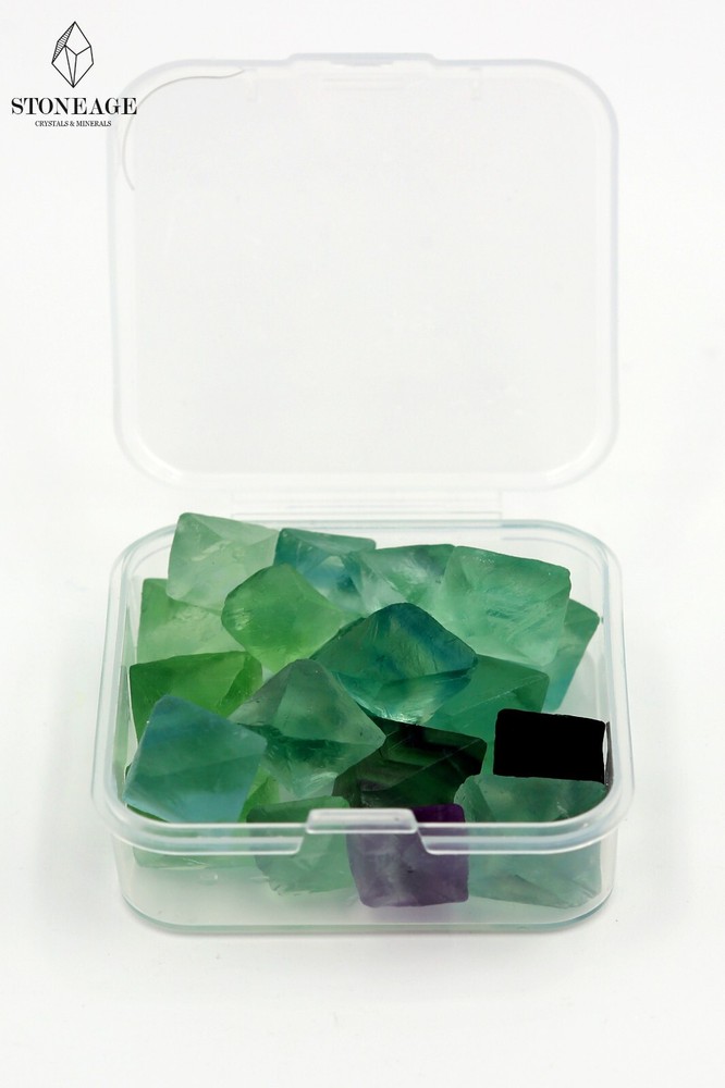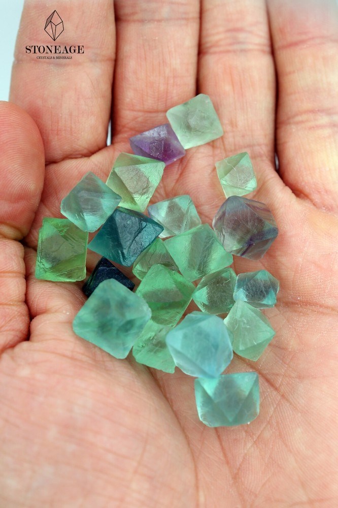 Natural Fluorite Octahedrons MSRP $12.99 Each box has approximately up to 22 pieces of octahedrons crystals We Are proud to Empower your business with premium quality Natural crystals at unbeatable wholesale and retail prices, delivered with reliability and excellence."A fluorite octahedron is a type of crystal structure commonly found in fluorite, which is a mineral composed of calcium fluoride (CaF₂). Fluorite often forms in geometric shapes, with the octahedron being one of its most characteristic forms.An octahedron is a polyhedron with eight triangular faces. Fluorite crystals can naturally form octahedral shapes due to the symmetry of its crystal lattice, where each of the faces is an equilateral triangle. The octahedral shape is one of the most common crystal forms for fluorite, alongside cubic forms.Fluorite is considered a powerful healing crystal with many potential benefits, both physical and metaphysical. Here are some commonly attributed benefits:Physical Benefits:1. Detoxification: Fluorite is believed to help cleanse and detoxify the body, particularly aiding in the elimination of toxins from the digestive and lymphatic systems.2. Strengthening Immune System: Fluorite is said to support the immune system by promoting healthy cellular function and helping the body fight off illness.3. Promotes Bone Health: As fluorite contains calcium, it is thought to help strengthen bones, teeth, and joints, supporting overall skeletal health