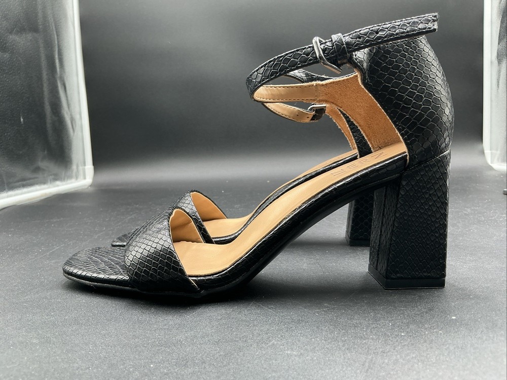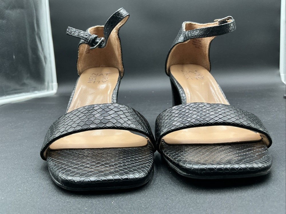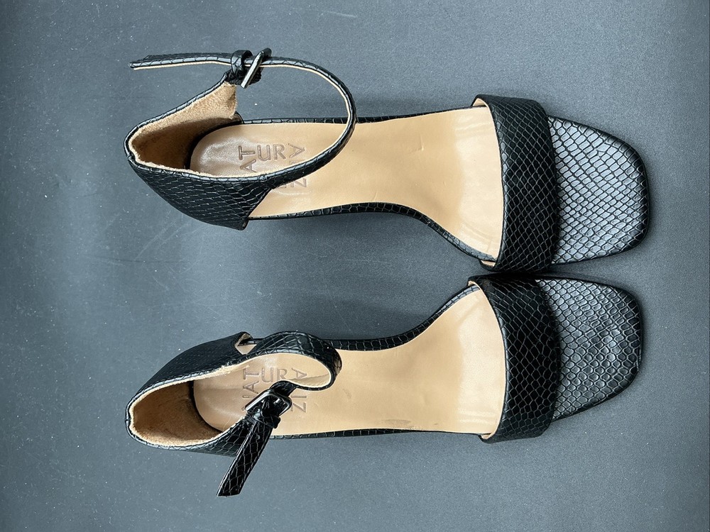 Upper Material: Unknown Department: Women US Shoe Size: 6.5 Heel Height: Mid (2-2.9 in) Country of Origin: China Color: Black Style: Strappy Type: Sandal Features: Ankle Strap Theme: Nature Brand: Naturalizer