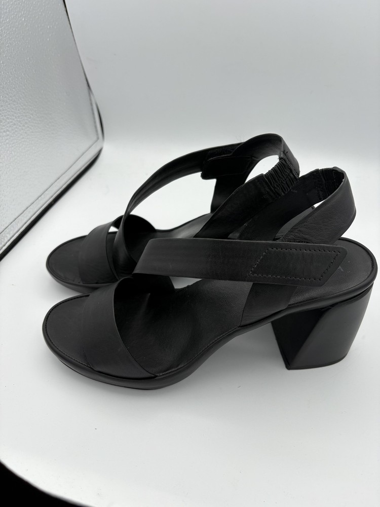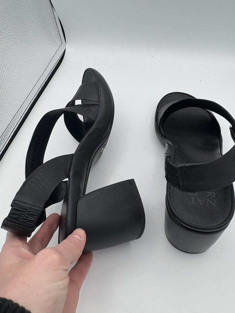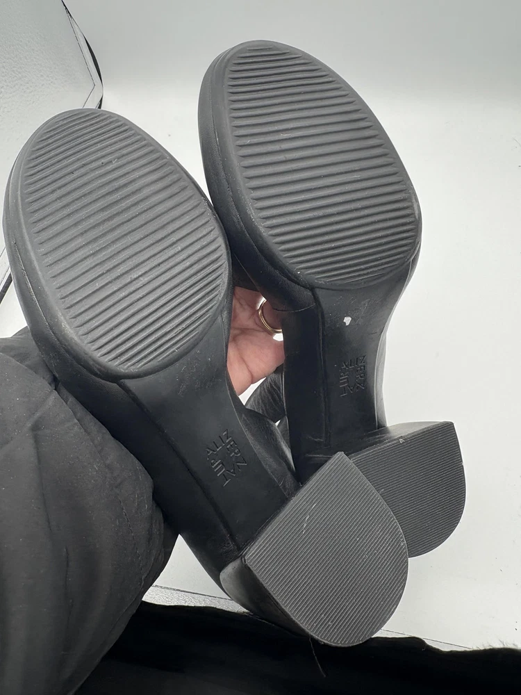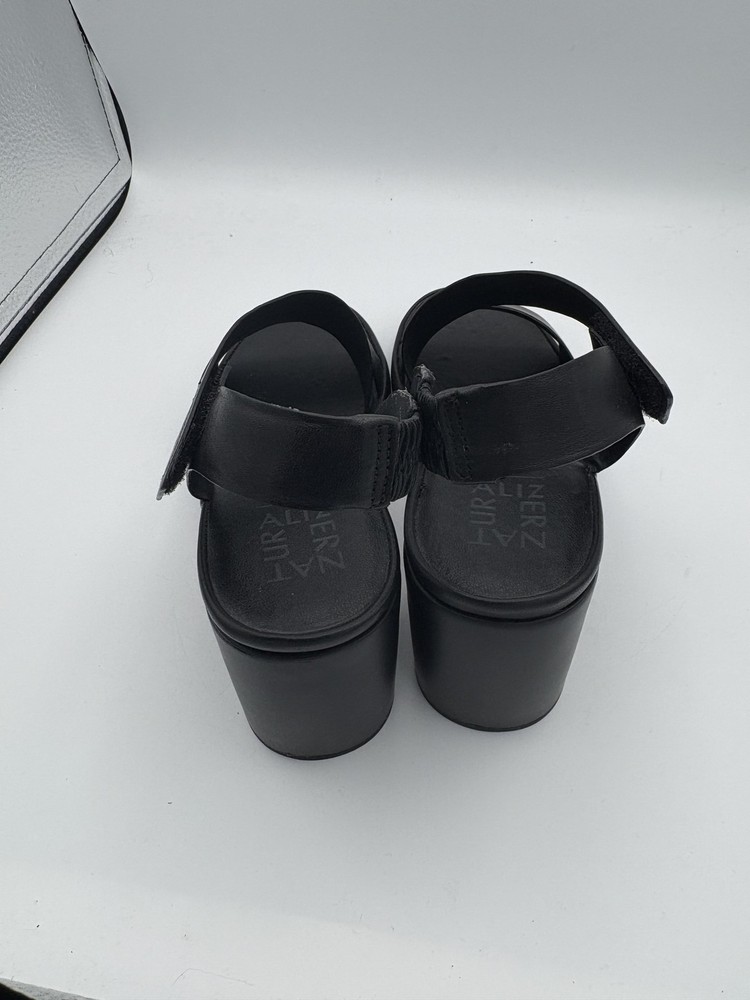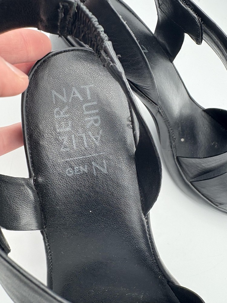 Brand: Naturalizer Item: Womens slingback block heel sandals with wide leather straps and open toes. Color: Solid black upper, footbed, and outsole. Gender/Size: Womens US size 8.5W with UK 6.5 and EU 39.5 sizing on interior stamp. Material: Leather upper with man made balance and synthetic outsole. Design details: Wide front vamp strap, crisscross slingback straps with elasticized heel inserts, open toe, sturdy block heel, and cushioned footbed. Style/Model: Naturalizer black leather slingback block heel comfort sandals. Tag details: Interior stamp lists US 8.5W, UK 6.5, EU 39.5, leather upper, balance man made materials, and Made in China. Occasion/Use: Suitable for casual outfits, workwear, and summer or warm weather events. Notes: Easy slip on slingback design with stretch panels for a flexible, secure fit.