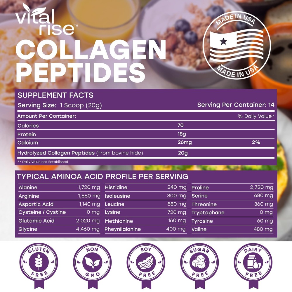 Experience the transformative power of Collagen Peptides, specially formulated for women. Providing 20g of Grass-Fed, non-GMO bovine collagen per serving, our formula is free from sweeteners, flavors, gluten, dairy, or soy. Collagen, the body's most abundant protein, forms the foundation of connective tissues such as hair, nails, tendons, ligaments, and skin. It helps maintain skin elasticity and suppleness, while also contributing to the toughness of tendons and ligaments. As we age, collagen production naturally declines, leading to sagging skin and achy joints. Collagen Peptides Powder contains hydrolyzed type 1 & 3 collagen, which supports skin, muscle, and bone health.* This hydrolyzed form is easily absorbed, allowing amino acids like glycine, proline, hydroxyproline, and alanine to promote collagen synthesis more effectively within the body. Discover Collagen Peptides as your secret to radiant skin, strong hair, and healthy joints. Enriched with pure collagen protein, our formula rejuvenates from within, reducing wrinkles and supporting mobility.* Elevate your wellness routine with and experience the difference firsthand. Healthier Skin, Hair, and Nails: Made with 20g of hydrolyzed collagen peptide per serving, our collagen makes your skin glow, boosts hair growth, and strengthens your nails, enhancing your body’s natural beauty so you look young and radiant.* Joint & Bone Support: Packed with essential amino acids for women, our collagen powder strengthens and lubricates your joints, reducing inflammation and easing pain from arthritis and stiffness.* Taste-Free Convenience: Enjoy all the benefits of collagen with our unflavored collagen protein powder. It blends seamlessly into any beverage without changing the taste. Pure and Simple for Your Diet: features pure hydrolyzed peptides from grass-fed, pasture-raised bovine sources with zero artificial fillers. Perfect for paleo, keto, and dairy-free diets, collagen easily integrates into your daily routine. Enjoy enhanced benefits with just one scoop in your morning coffee, smoothie, oatmeal, and more. Formulated With Type I & III Peptides: These peptides are renowned for their ability to enhance skin elasticity and reduce wrinkles. These peptides also play a crucial role in supporting joint health and mobility, providing essential support for maintaining flexibility and reducing discomfort. Additionally, the collagen peptides in Collagen contribute to stronger hair and nails, promoting vitality and resilience. Moreover, they support gut health and digestion, aiding in the maintenance of a healthy digestive system.* Effortlessly Dissolves: Our hydrolyzed collagen peptides powder dissolves quickly in both hot and cold drinks. Simply add and stir into your coffee, smoothie, oatmeal, and more for an easy daily boost. Ethically Crafted and Made in the USA: At , we take pride in our sustainable and traceable sourcing of our collagen. Put your trust in a product that is both effective and responsibly produced, with a commitment to our environment.