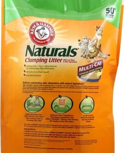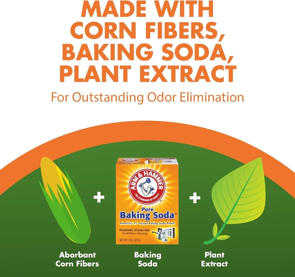 AN ODOR-FREE HOME STARTS HERE…NATURALLY! Contains natural corn fibers, plant based clumping agent, baking soda, plus mineral oil for dust control. Also contains an artificial fragrance. Outstanding cat odor control for multi-cat households. OUTSTANDING ODOR ELIMINATION WITH NATURAL INGREDIENTS. The power of ARM HAMMER Baking Soda + Corn + Plant extracts deliver superior odor control for multi-cat households. Natural clumping cat litter destroys the toughest kitty litter box odors. HIGHLY ABSORBENT, ABSORBS 2X AS MUCH LIQUID as clumping clay cat litter. Easy to scoop cat litter clumping binds into small, light, easy to remove clumps. With natural corn fibers, a plant-based clumping agent + Baking Soda.