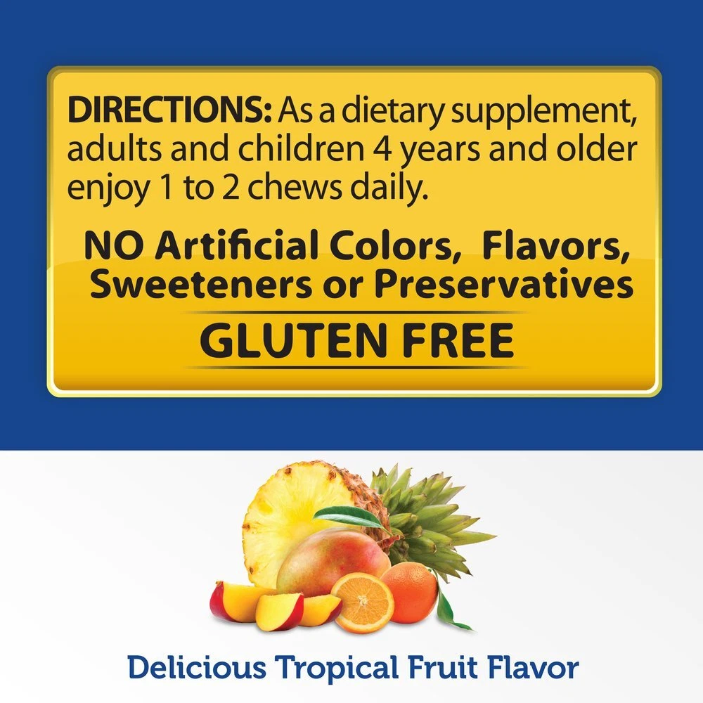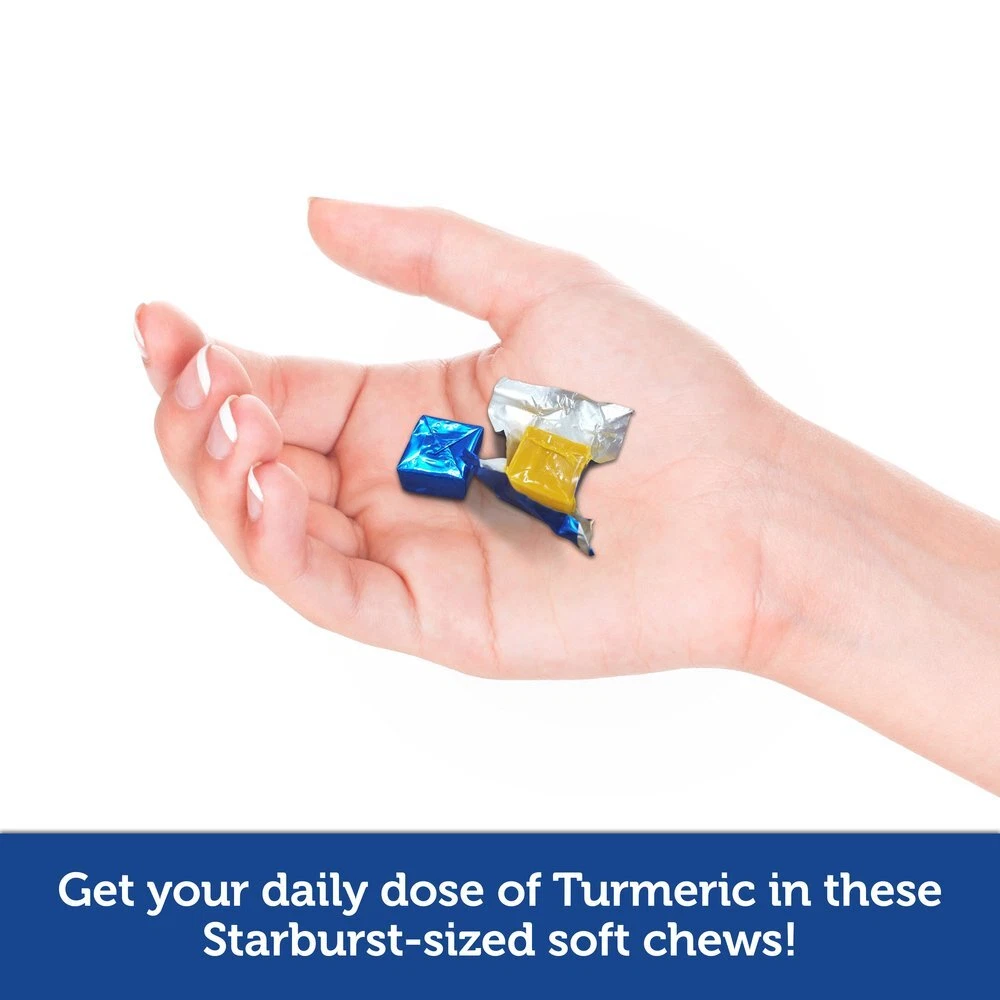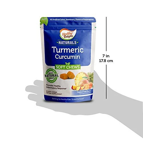 If you want to enjoy the benefits of this ancient spice, but you’re not all that keen on the flavor of turmeric, there is an alternative. Try Naturals Tropical Fruit-flavored Turmeric Curcumin Soft Chews!Tropical Fruit Turmeric Curcumin Soft ChewsAll the power of Turmeric without the Turmeric taste If you want to enjoy the benefits of this ancient spice, but you’re not all that keen on the flavor of turmeric, there is an alternative. Try Naturals Turmeric Curcumin Soft Chews! Enjoy a powerful dose of turmeric curcumin wrapped up in a delicious tropical fruit snack. Just delectable soft chew delivers 100mg of Turmeric blend with Turmeric and Turmeric Extract 95% curcuminoids. But don’t let the name fool you—these bite-sized little bundles of Turmeric are naturally sweetened with a tropical fruit flavor!The tangy tropical fruit flavor combines with the chewy texture of candy to deliver of the best-tasting turmeric supplements ever. A low-calorie, low-sugar treat, Naturals Turmeric Curcumin Soft Chews are an enjoyable, innovative way to get your turmeric supplements. Benefits of Tropical Fruit Turmeric Curcumin Soft Chews• Promotes healthy inflammatory response • 100mg turmeric blend • Only 2g of sugar and 20 calories per serving• NO artificial colors, flavors, or preservatives• Non GMO & gluten freeChewy support for healthy inflammatory responsePromote healthy inflammatory response with a delicious chew you’ll look forward to taking daily. Turmeric Curcumin Soft Chews fit perfectly into busy schedules, making them easy to add to your wellness program. Just chew daily delivers the high quality Turmeric Curcumin you want more of in your daily diet. Order yours online now!Serving size: 1 chew Servings per container: 30Directions for use: As a dietary , adults and children 4 years and older enjoy 1 to 2 chews daily. FDA Each soft chew contains 100 mg of our TURMERIC blend promoting healthy INFLAMMATORY RESPONSE These GREAT TASTING tropical fruit flavor chews have only 2 grams of sugar & 20 calories per serving Great any time of the day and small enough to take with you to eat anywhere-A fast option for anyone ON-THE-GO! All of our Naturals chews are free from artificial flavors, colors, sweeteners, and preservatives