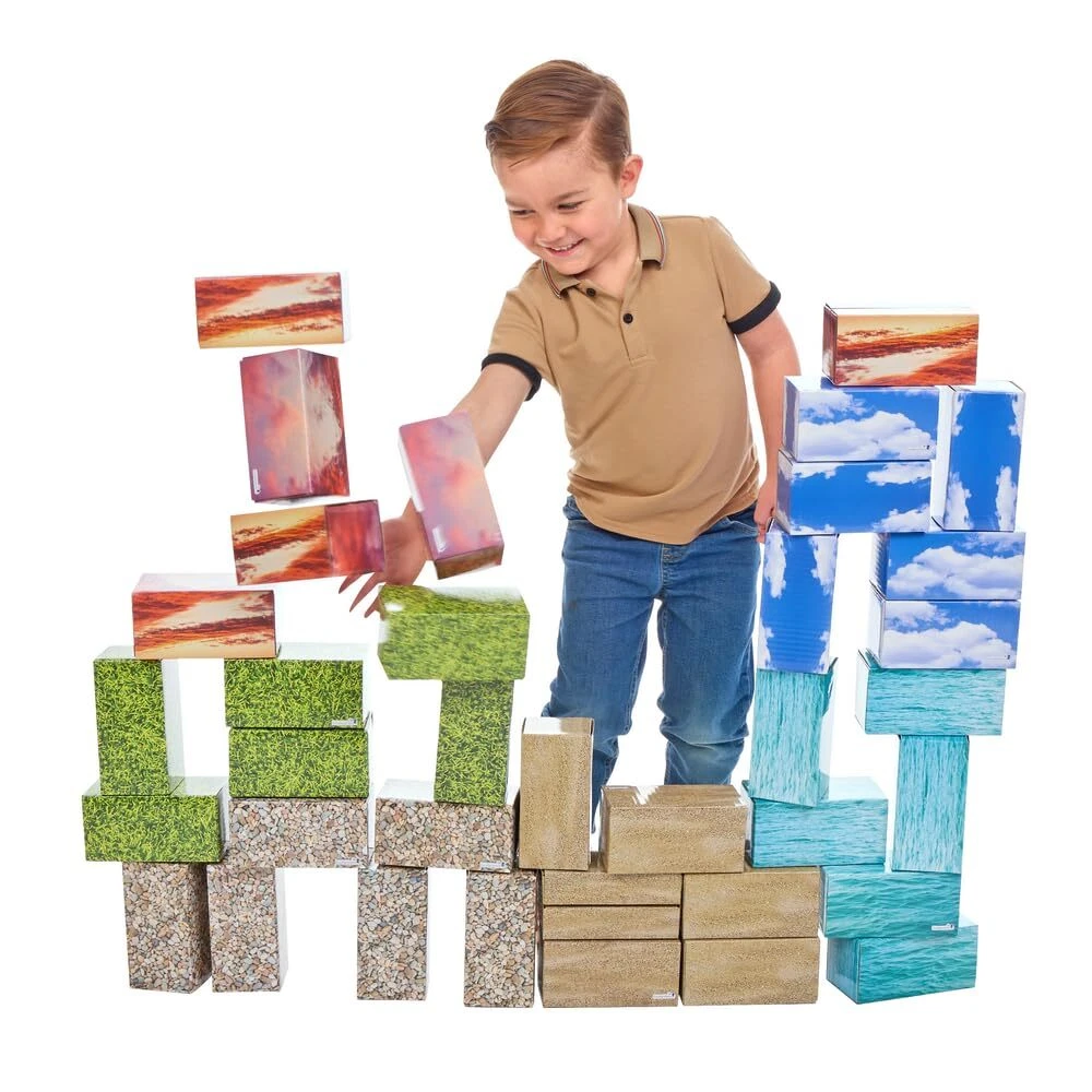 AGES/GRADES: 3+Assembly RequiredBuild your own world where the sky meets the grass! These chunky, colorful blocks are comfy to hold and fun to stack high. Each set includes 36 lightweight printed blocks with colorful photos of pebbles (6 blocks), grass (6 blocks), water (6 blocks), sand (6 blocks), and beautiful sky (12 blocks). Each block is 6 in x 3 in x 3 in and is strong and sturdy for everyday play. Engaging in STEM activities and constructive play can help children develop problem solving, motor skills, planning skills, and spatial awareness. Children can even work together to build on social skills and planning as a group to build a scene. These blocks can be used to create scenery to tell a story, where can piece together a world all their own! WHAT YOU GET: Set of 36 blocks each 6"L x 3"W x 3"H (15.2 cm x 7.6 cm x 7.6 cm). 6 Pebble Blocks, 6 Grass Blocks, 6 Water Blocks, 6 Sand Blocks, 12 Sky Blocks Included. Assembly Required. Includes 1 e HANDS-ON STEM PRACTICE: Children can build and problem-solve engineering their own scenes while building STEM skills! STURDY CONSTRUCTION: These blocks are built to stand up to everyday play. Each block is sturdily laminated. The lightweight nature of the blocks makes them ideal to build up high! INDEPENDENT PRACTICE: Children can easily interact with these materials independently boosting independence and confidence during constructive play. Constructive play also helps a build problem- SUPPORTS SMALL GROUPWORK: Take the learning further and build social skills by challenging a small group of children to collaborate and work together to create a scene.
