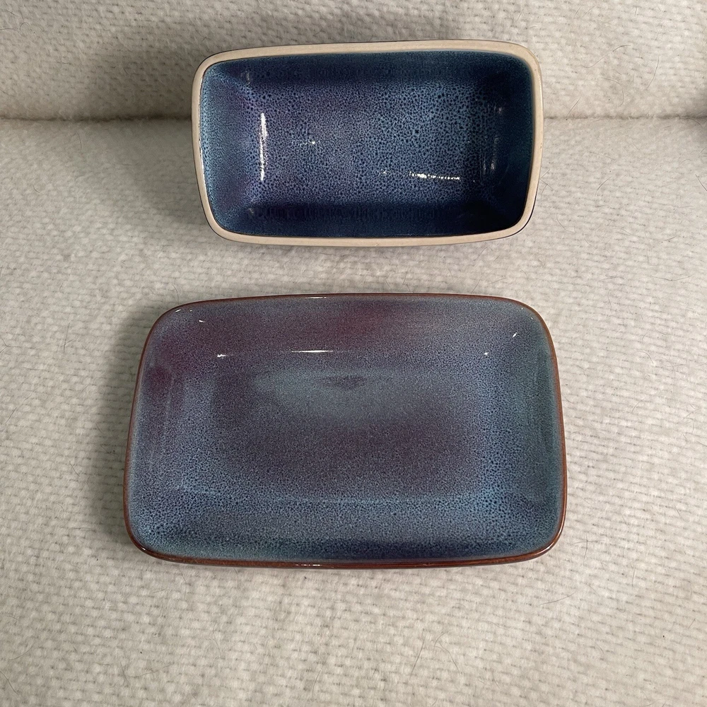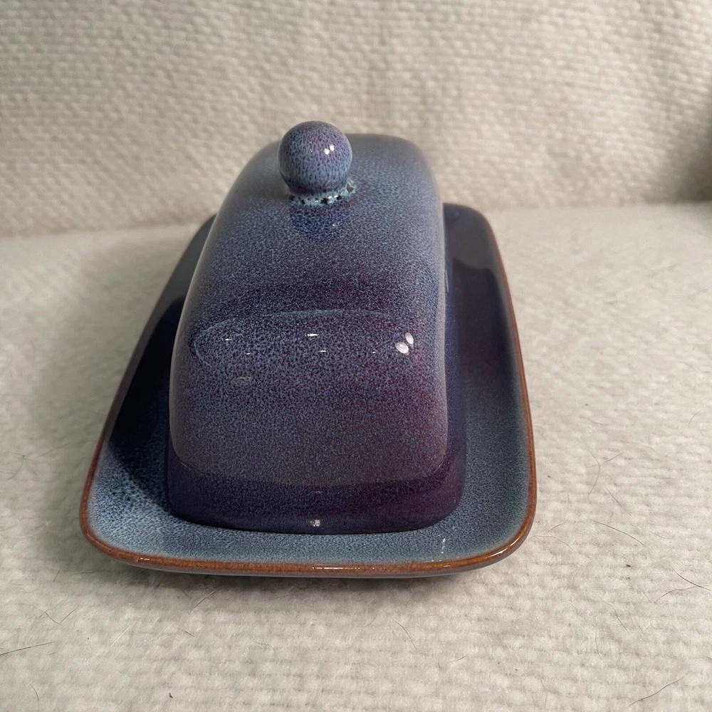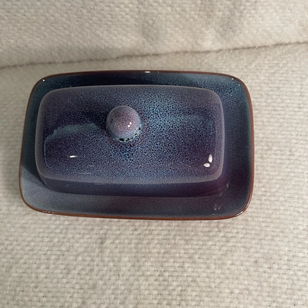 Add a touch of elegance to your dinner table with this beautiful two-piece butter dish set from Nature Elements. The rectangular stoneware dish comes with a matching lid, both in a stunning purple-blue color. This vintage art deco style piece is perfect for any occasion and is sure to impress your guests. Crafted using pottery production techniques, this butter dish set is both durable and stylish. The set includes one butter dish with lid, measuring 7.25” in length, 4.5” in width, and 3.75” in height. The backstamp is printed and the item weighs 1.9 lbs. Ideal for any nature or stoneware collection, this set is a must-have for any pottery enthusiast. Excellent condition. No chips or cracks.
