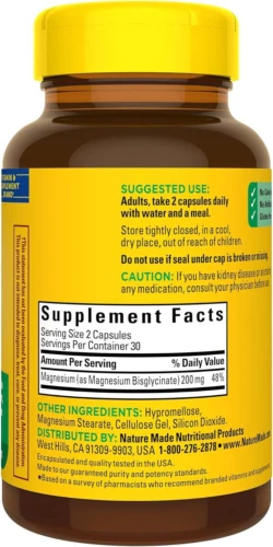 Nature Made Magnesium Glycinate 200 mg per Serving, Magnesium Supplement for Muscle, Heart, Nerve and Bone Support, 60 Magnesium Bisglycinate Capsules, 30 Day Supply Product Details Product Dimensions : 2.44 x 2.44 x 4.44 inches; 3.62 ounces Item model number : 4313 Brand: Nature Made Item Form: Capsule Primary Supplement Type: Magnesium Unit Count: 60 Count Flavor: Unflavored Heart, nerve and bone support supplement: contains one 60 count bottle of Nature Made Magnesium Glycinate 200 mg per serving Capsules for a 30-day supply A high absorption Magnesium supplement for women and men that helps support muscle relaxation, bone health, heart health, nerve health Gentle on the stomach, Magnesium Glycinate helps relax the body, and is a highly bioavailable form of magnesium that is 100% chelated Magnesium helps support the production of Melatonin Adults take two Magnesium capsules daily with water and a meal This gluten free Magnesium 200mg supplement contains no color added and no artificial flavors These statements have not been evaluated by the Food and Drug Administration; this product is not intended to diagnose, treat, cure, or prevent any disease The size of one pill is 1 inch Nature Made Magnesium Glycinate 200 mg per serving is a 100% chelated, high absorption Magnesium supplement for men and women that supports muscle relaxation, bone health, heart health, and nerve health. Sourced from high-quality ingredients, this gluten free Magnesium Glycinate supplement contains no color added and no artificial flavors. Magnesium is an essential mineral required for more than 300 enzymatic reactions in the body. Magnesium-Glycinate is gentle on the stomach, helps relax the body, and offers dietary support in two daily Magnesium capsules. With over half of the U.S. population not consuming enough Magnesium in their diet, Magnesium supplements, like this Magnesium Glycinate 200mg per serving supplement, help to contribute to the Magnesium your body needs (1). Adults take two Magnesium Glycinate capsules daily with water and a meal. Nature Made supplements are quality you can trust. (1) Reider, C.A.; Chung, R.-Y.; Devarshi, P.P.; Grant, R.W.; Hazels Mitmesser, S. Inadequacy of Immune Health Nutrients: Intakes in US Adults, the 2005–2016 NHANES. Nutrients 2020, 12, 1735. *Based on a survey of pharmacists who recommend branded vitamins and supplements. TRAACS™ is a trademark of Albion Laboratories, Inc.
