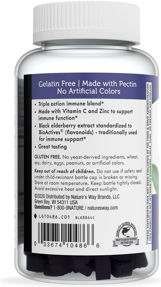 Sambucus Immune Gummies are made with 90 mg of vitamin C, 30 mcg (1,200 IU) of vitamin D3 and 7.5 mg of zinc per 2-gummy serving to support immune health.* Also with highly concentrated, premium black elderberry extract. Elderberries have naturally-occurring anthocyanins, which provide antioxidant support.* Antioxidants help neutralize free radicals.* Adults and children ages 4+, chew 2 gummies daily. Gluten free and vegetarian. No wheat, dairy, egg, peanut or artificial colors. Gummies made with plant-based pectin, not gelatin. Nature’s Way is pleased to share that Sambucus Immune Gummy and Sambucus Immune Gummy for kids were voted #1 Product of the Year.** (**Winner Immunity category. Survey of 40,000 people by Kantar.) You’ll love making these immune support gummies a part of your daily routine.* Nature’s Way Sambucus Immune Gummies for ages 4+ help support immune health with high potency vitamins C & D3, an excellent source of zinc, and a highly concentrated black elderberry extract.* Our black elderberry extract is made from berries that are hand-picked and harvested at their peak in select locations across Europe. The extract has naturally-occurring anthocyanins for antioxidant support, and every lot is tested to ensure we’re bringing you the best.**This statement has not been evaluated by the Food and Drug Administration. This product is not intended to diagnose, treat, cure, or prevent any disease.