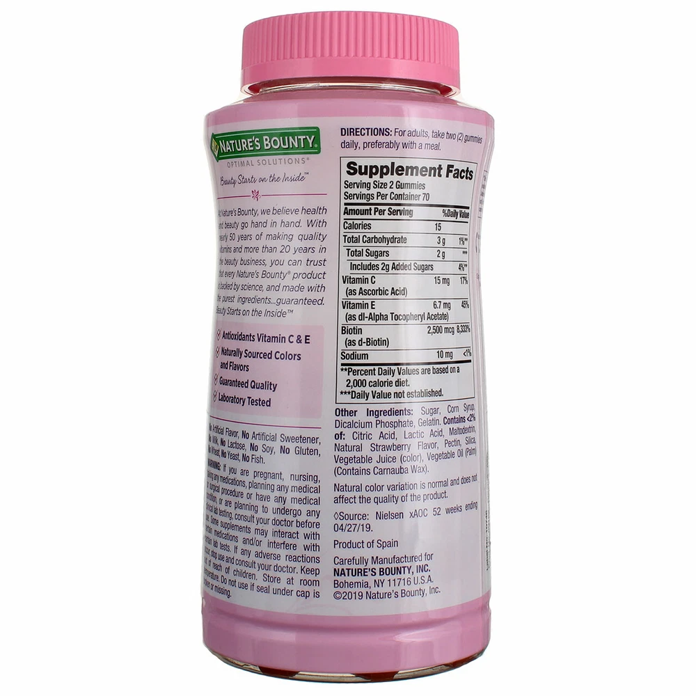 Product Description From the #1 brand for hair, skin, and nails,** Nature's Bounty Hair, Skin & Nails Gummies contains with biotin and vital nutrients to support beautiful hair, glowing skin, and healthy nails from the inside out.* Each serving of our delicious strawberry-flavored biotin gummies contains antioxidants vitamin E and vitamin C. Vitamin E contributes to skin health; vitamin C is involved in collagen production and formation, which forms the basis for vibrant skin; and biotin helps to maintain healthy hair.* Every Nature's Bounty beauty supplement is backed by a combination of nature and science, and made with the purest ingredients, guaranteed. Our unique formula is laboratory-tested plus is free of milk, lactose, soy, gluten, wheat, yeast, or fish. If you're hoping to look and feel your best, Nature's Bounty Hair, Skin & Nails vitamins for women are a great addition to your everyday beauty routine and a delicious way to support your natural beauty from within.* Nature's Bounty Hair Skin and Nails Vitamins With Biotin, Gummies, 140 Ct: #1 BRAND FOR HAIR, SKIN, AND NAILS.** This dietary supplement in gummy form is formulated to enhance your beauty routine with the purest ingredients, guaranteed SUPPORTS BEAUTIFUL HAIR, GLOWING SKIN, AND HEALTHY NAILS.* Strawberry-flavored gummies contain biotin to support healthy hair, skin, and nails plus antioxidants C & E* BEAUTY-SUPPORTING BIOTIN.* Nature's Bounty Hair, Skin & Nails Gummies contain 2,500 mcg of biotin per serving, a vital nutrient that helps maintain healthy hair and support overall beauty* FORMULATED TO HELP MAINTAIN HEALTHY SKIN.* Vitamin E, naturally found on the outermost skin surface, contributes to skin health, while Vitamin C is involved in collagen production and formation, which forms the basis for vibrant skin* DELICIOUS STRAWBERRY-FLAVORED GUMMIES. Enjoy soft, chewy strawberry-flavored gummies that are laboratory-tested plus are free of milk, lactose, soy, gluten, wheat, yeast, or fish **Source: IRI Total US - Multi Outlet: Latest 52 weeks ending 9/27/20 *These statements have not been evaluated by the Food and Drug Administration. This product is not intended to diagnose, treat, cure or prevent any disease. Ingredients Sugar, corn syrup, dicalcium phosphate, gelatin. Contains <2% of: citric acid, lactic acid, maltodextrin, natural strawberry flavor, pectin, silica, vegetable juice (color), vegetable oil (palm) (contains carnauba wax).No artificial flavor, no artificial sweetener, no milk, no lactose, no soy, no gluten, no wheat, no yeast, no fish. Instructions Stop Use Indications: This statement has not been evaluated by the Food and Drug Administration. These products are not intended to diagnose, treat, cure or prevent any disease. Source: Nielsen xAOC52 weeks ending 12/30/17. Statements regarding dietary supplements have not been evaluated by the FDA and are not intended to diagnose, treat, cure, or prevent any disease or health condition. Health Concern: Hair Support Nail Support Skin Support Beauty Support Product Description From the #1 brand for hair, skin, and nails,** Nature's Bounty Hair, Skin & Nails Gummies contains with biotin and vital nutrients to support beautiful hair, glowing skin, and healthy nails from the inside out.* Each serving of our delicious strawberry-flavored biotin gummies contains antioxidants vitamin E and vitamin C. Vitamin E contributes to skin health; vitamin C is involved in collagen production and formation, which forms the basis for vibrant skin; and biotin helps to maintain healthy hair.* Every Nature's Bounty beauty supplement is backed by a combination of nature and science, and made with the purest ingredients, guaranteed. Our unique formula is laboratory-tested plus is free of milk, lactose, soy, gluten, wheat, yeast, or fish. If you're hoping to look and feel your best, Nature's Bounty Hair, Skin & Nails vitamins for women are a great addition to your everyday beauty routine and a delicious way to support your natural beauty from within.* Nature's Bounty Hair Skin and Nails Vitamins With Biotin, Gummies, 140 Ct: #1 BRAND FOR HAIR, SKIN, AND NAILS.** This dietary supplement in gummy form is formulated to enhance your beauty routine with the purest ingredients, guaranteed SUPPORTS BEAUTIFUL HAIR, GLOWING SKIN, AND HEALTHY NAILS.* Strawberry-flavored gummies contain biotin to support healthy hair, skin, and nails plus antioxidants C & E* BEAUTY-SUPPORTING BIOTIN.* Nature's Bounty Hair, Skin & Nails Gummies contain 2,500 mcg of biotin per serving, a vital nutrient that helps maintain healthy hair and support overall beauty* FORMULATED TO HELP MAINTAIN HEALTHY SKIN.* Vitamin E, naturally found on the outermost skin surface, contributes to skin health, while Vitamin C is involved in collagen production and formation, which forms the basis for vibrant skin* DELICIOUS STRAWBERRY-FLAVORED GUMMIES. Enjoy soft, chewy strawberry-flavored gummies that are laboratory-tested plus are free of milk, lactose, soy, gluten, wheat, yeast, or fish **Source: IRI Total US - Multi Outlet: Latest 52 weeks ending 9/27/20 *These statements have not been evaluated by the Food and Drug Administration. This product is not intended to diagnose, treat, cure or prevent any disease. Ingredients Sugar, corn syrup, dicalcium phosphate, gelatin. Contains <2% of: citric acid, lactic acid, maltodextrin, natural strawberry flavor, pectin, silica, vegetable juice (color), vegetable oil (palm) (contains carnauba wax).No artificial flavor, no artificial sweetener, no milk, no lactose, no soy, no gluten, no wheat, no yeast, no fish. Instructions Stop Use Indications: This statement has not been evaluated by the Food and Drug Administration. These products are not intended to diagnose, treat, cure or prevent any disease. Source: Nielsen xAOC52 weeks ending 12/30/17. Statements regarding dietary supplements have not been evaluated by the FDA and are not intended to diagnose, treat, cure, or prevent any disease o