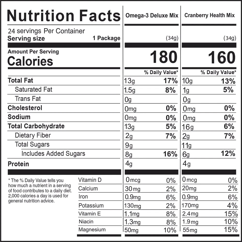 Birkenstar Nature's Garden Trail Mix Snack Packs (1.2oz., 24pk) Great Price Product Discription: Nature's Garden Multi-Pack Trail Mix is the ideal choice when you're looking for a healthy snack that delivers in both taste and health benefits. With our 24 pack bag of 1.2oz serving, Nature's Garden Trail Mix provides 12 packs of Cranberry Health Mix and 12 Packs of Omega-3 Deluxe Mix. There is nothing but the best, natural ingredients in these mixes, giving you exactly what you need for a flavor filled on-the-go snack. Our Cranberry Health Mix features a blend of Cranberries, Raisins, Walnuts, Almonds, Pepitas, Roasted Peanuts and Sunflower Seeds. The Omega-3 Deluxe Mix is a blend of Cranberries, Almonds, Walnuts, Pecans, Pistachios, and Pepitas. Convenient, functional, and always delicious! About This Item: Two flavor rich, heart healthy mixes • Omega-3 Deluxe Mix – packed full of Omega-3 fatty acids • Cranberry Health Mix – low calorie and rich in flavor • Perfect size for on-the-go snacking • Heart Healthy, Kosher Certified, cholesterol free, 100% delicious Payment Policy We accept all payment methods. Pay as soon as possible after winning the auction, so we can ship your item sooner. Return Policy The product can be returned within the 30 days of purchase if the customer is not satisfied.The product must be returned in the original packing and customer will pay for return shipping. Shipping Policy We offer FREE shipping on all orders.The Item is usually shipped within 1-3 bussines days or sooner after the payment is received and is delivered within in 3-6 bussines days or sooner after the shipment. In any case, if the item is lost or there is an uncertain delay in the delivery by shipping carrier we request you to contact us, so we can help you out with a refund or replacement. Feedback Customer satisfaction is our first priority.We always strive to create a positive customer experience. If you have any concern, please contact us.We will do our best to solve your problem as soon as possible. Birkenstar