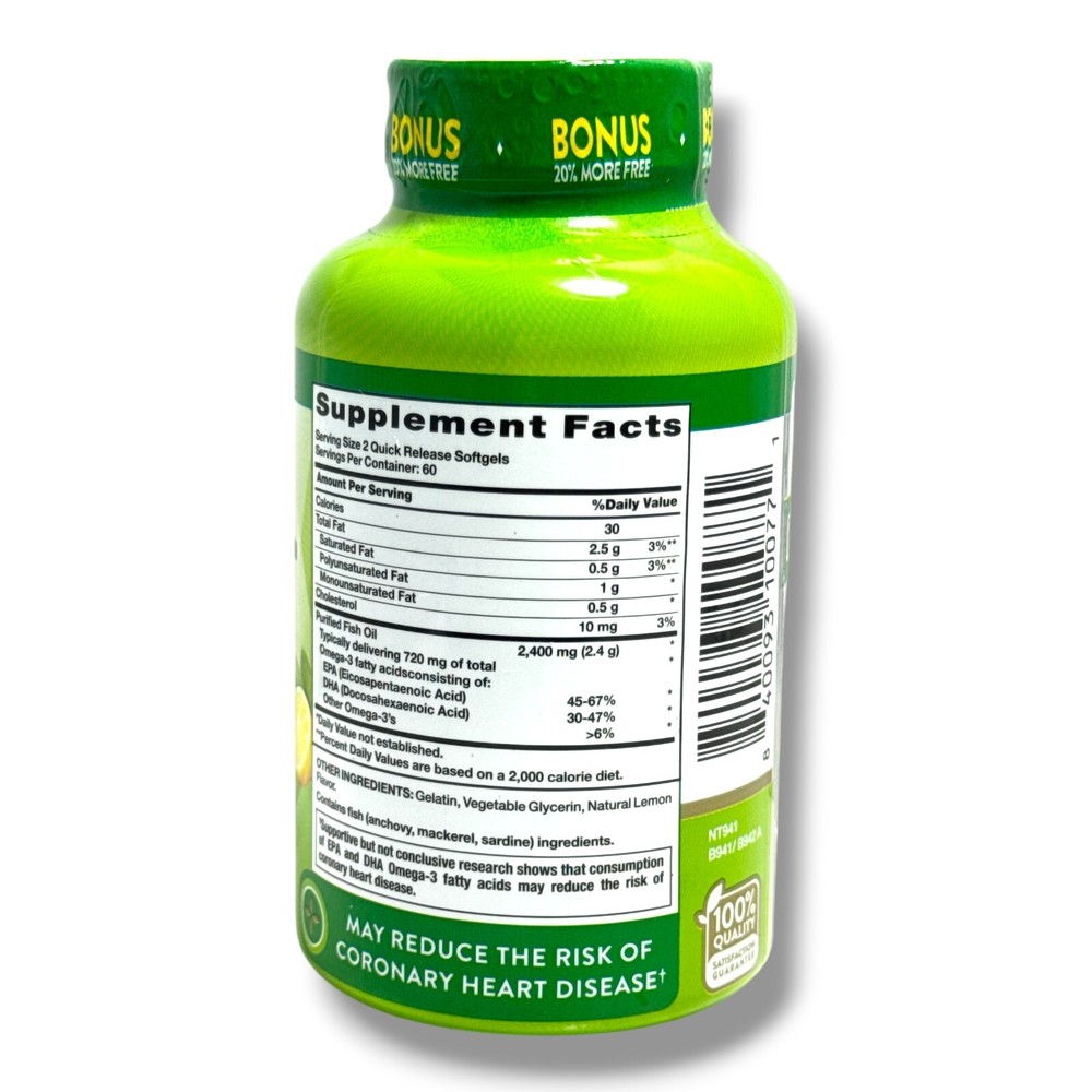Nature's Truth Natural Lemon Flavor Fish Oil 2,400mg/Omega-3 720mg -120 Quick Release Softgels- Dietary Supplement EXP 10-2027 NEW SEALED