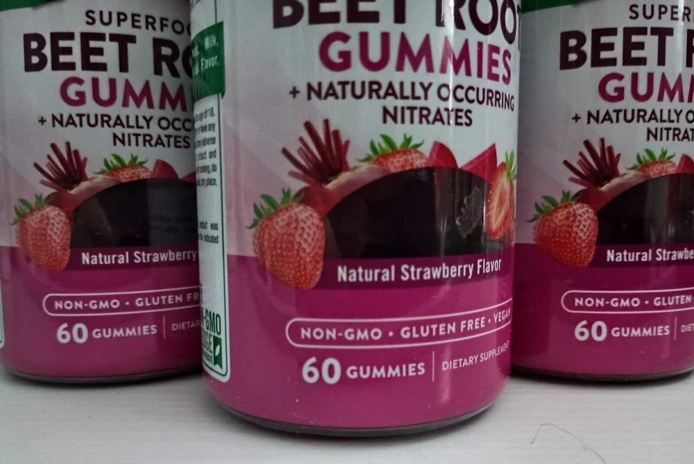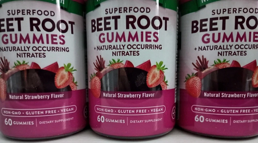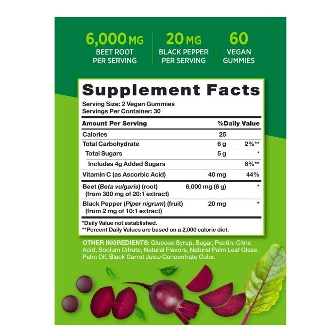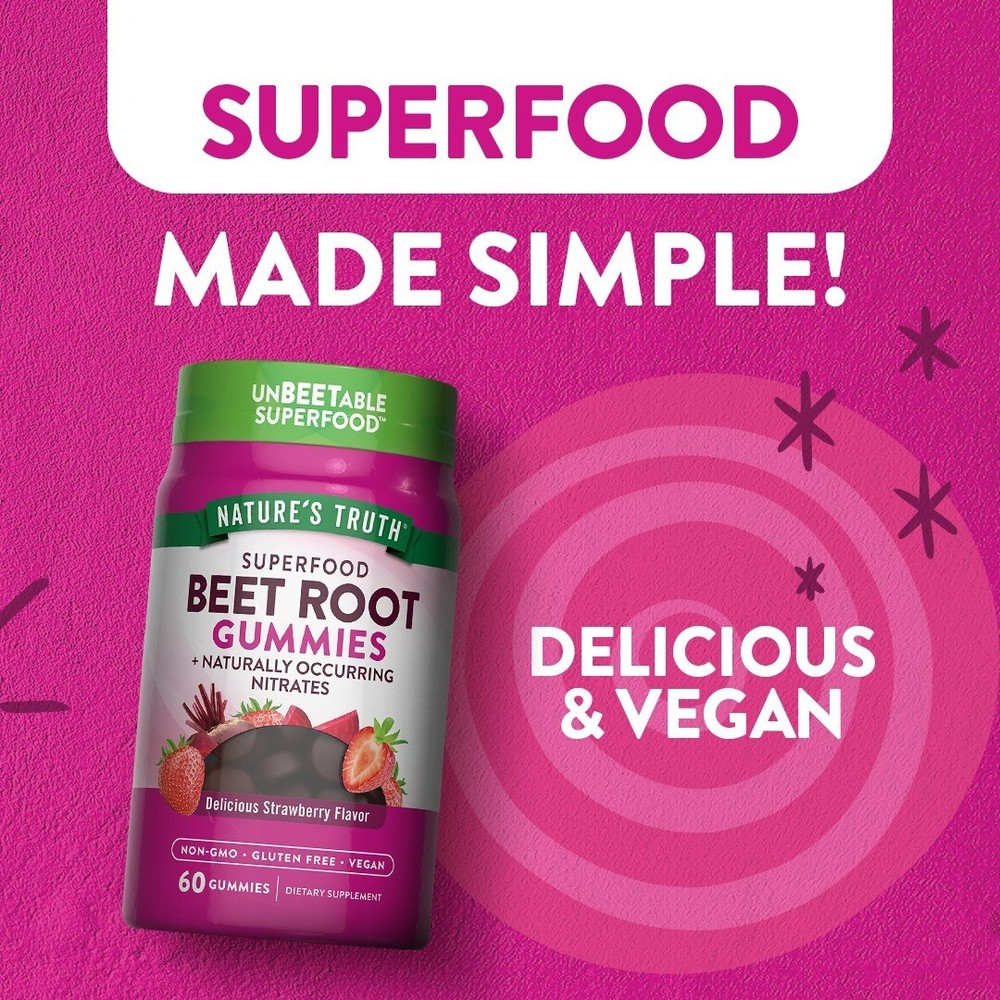 Nature's Truth® Superfood Beet Root Gummies, 60 Count (3 Pack) Delicious Strawberry Flavor - Non-GMO, Vegan, Gluten Free Three 60 Count Bottles - Best By Date: 12/2025 by Nature’s Truth® Have your beets and enjoy them too with delicious Nature’s Truth® Beet Root Gummies. Beet Root is a nutrient-rich superfood with naturally occurring antioxidants, which derives from the taproot of the beet plant, Beta vulgaris. Consuming raw beet root is quite common today, but a bitter aftertaste is often associated with it, while our natural strawberry flavored gummies are deliciously easy! Highlights: • 6,000 mg Equivalent of Beet Root per serving • Delicious Gummies – Natural Strawberry Flavor! • An excellent source of Vitamin C • With 20 mg Equivalent of Black Pepper • Vegan, Non-GMO & Gluten-free • Wheat Free • Yeast free • Milk & Lactose Free, • Soy Free • No Artificial Flavor or Sweetener These beet root with black pepper gummies are so good for your body. They also taste delicious. These are packed with vitamins and minerals. These are a great source of antioxidants that support your organs including your heart. They are a natural way to support your kidneys and liver. For centuries, beets were cultivated & considered a staple in ancient Greece, Rome, and Egypt. The indigenous people consumed the leaves of the beet and sometimes used the beet root juice to add color to bland foods. Nature’s Truth® Beet Root Gummies deliver this nutrient rich superfood in two Vegan, Natural Strawberry Flavored gummies a day. Each serving is equivalent to 6,000 mg of pure beet root, plus 20 mg of Black Pepper (from 2 mg of 10:1 extract) for optimal absorption. These gummies are also vegan, Non-GMO and free from gluten, wheat, yeast, milk, lactose, soy, artificial flavor & artificial sweetener. BEET ROOT: Contains the equivalent of 6000mg of nutrient-rich Beet Root per serving SUPERFOOD: Our Beet Root formula provides naturally occurring phytonutrients ENHANCED WITH BLACK PEPPER: For optimal absorption VEGAN GUMMIES: Delicious natural strawberry flavor gummy vitamin EXPERTS YOU CAN TRUST: Backed by three generations of Vitamin Innovators for unrivaled quality NATURALLY FREE OF: Gluten, Wheat, Milk, Lactose, Soy, Artificial Sweetener & Flavor & Non-GMO At Nature’s Truth® our consumers’ wellbeing takes priority. We ensure quality, transparency, and consistency with every product that we distribute. Earning the trust of your family is not something we take lightly, and we will continue to serve our customers, in a way that demonstrates our gratitude. Suggested use: For adults, take two (2) vegan gummies daily, preferably with a meal. Do not exceed recommended dosage