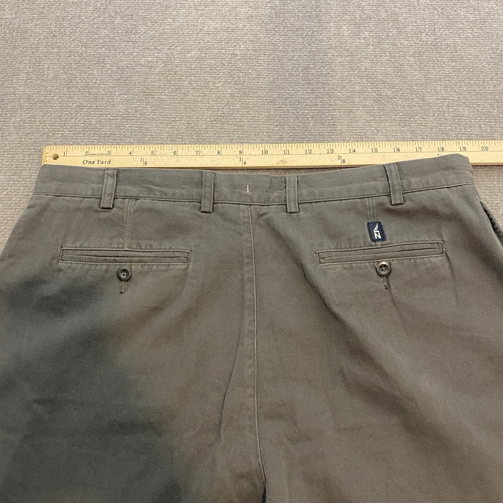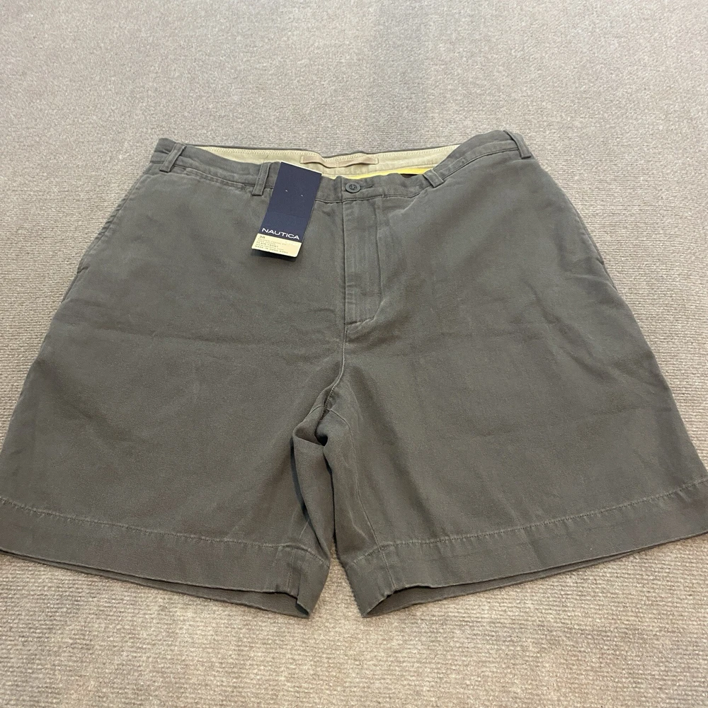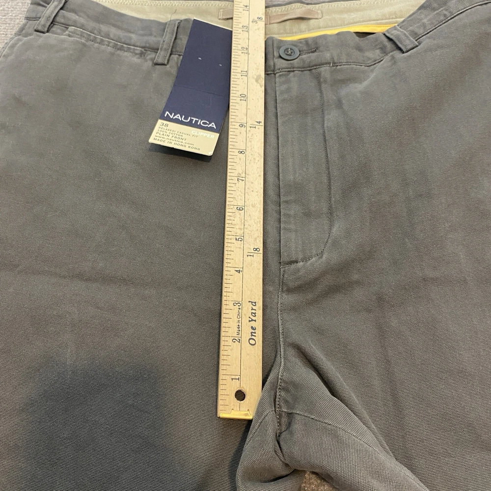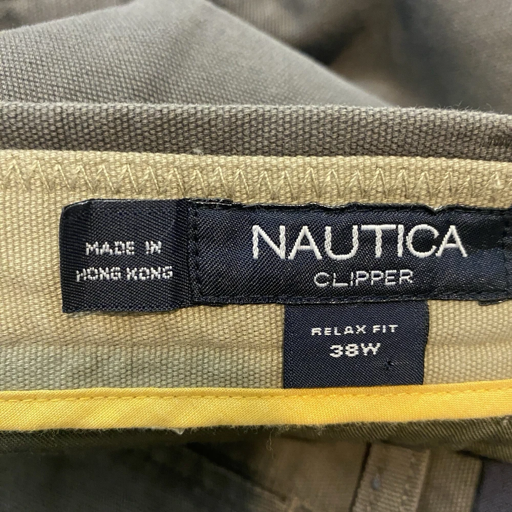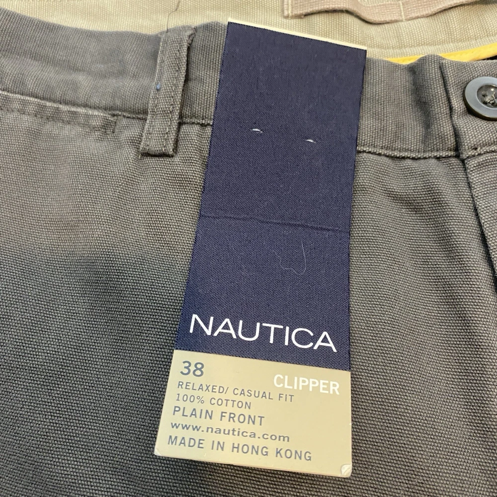 Size: 38 Season: Fall, Spring, Summer Pattern: Solid Country/Region of Manufacture: Hong Kong Garment Care: Machine Washable Fabric Type: Knit Vintage: No Department: Men Front Type: Flat Front Theme: Classic Features: Pockets, Stretch Style: Chino Rise: High (Greater than 12 in) Personalize: No Color: Brown Material: Cotton Occasion: Casual Brand: Nautica Accents: Logo Waist Size: 38 in Inseam: 8 in Handmade: No Size Type: Regular Fit: Relaxed UPC: Does not apply Pocket Type: Slash Pocket Closure: Zip gtin13: Does not apply