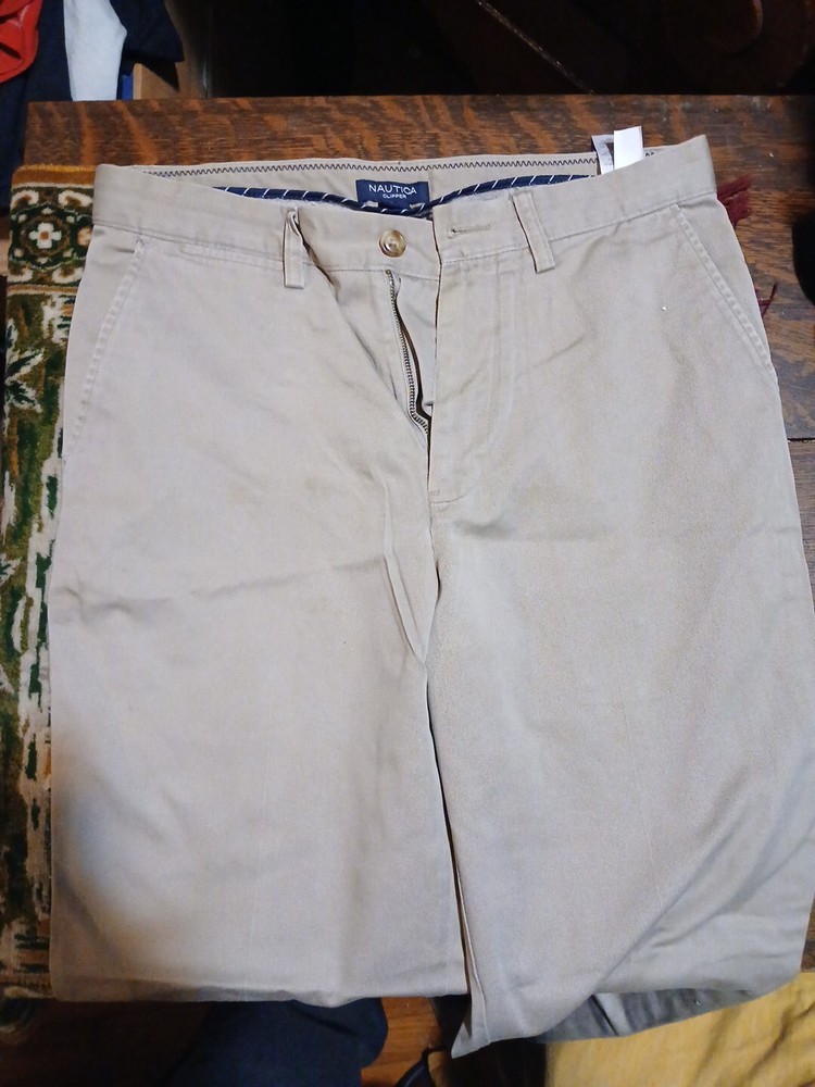 Elevate your casual style with these Nautica Clipper Relaxed Fit pants. The khaki color and solid pattern make them versatile for any occasion, whether it's a casual walk or a day out with friends. The pants are made of 100% cotton twill fabric, which provides comfort and durability. Featuring a button closure and slash pockets, these pants are both stylish and functional. The flat front design and straight leg style provide a classic look, while the regular fit ensures a comfortable wear. Perfect for summer, fall, or spring, these pants are a great addition to any wardrobe.