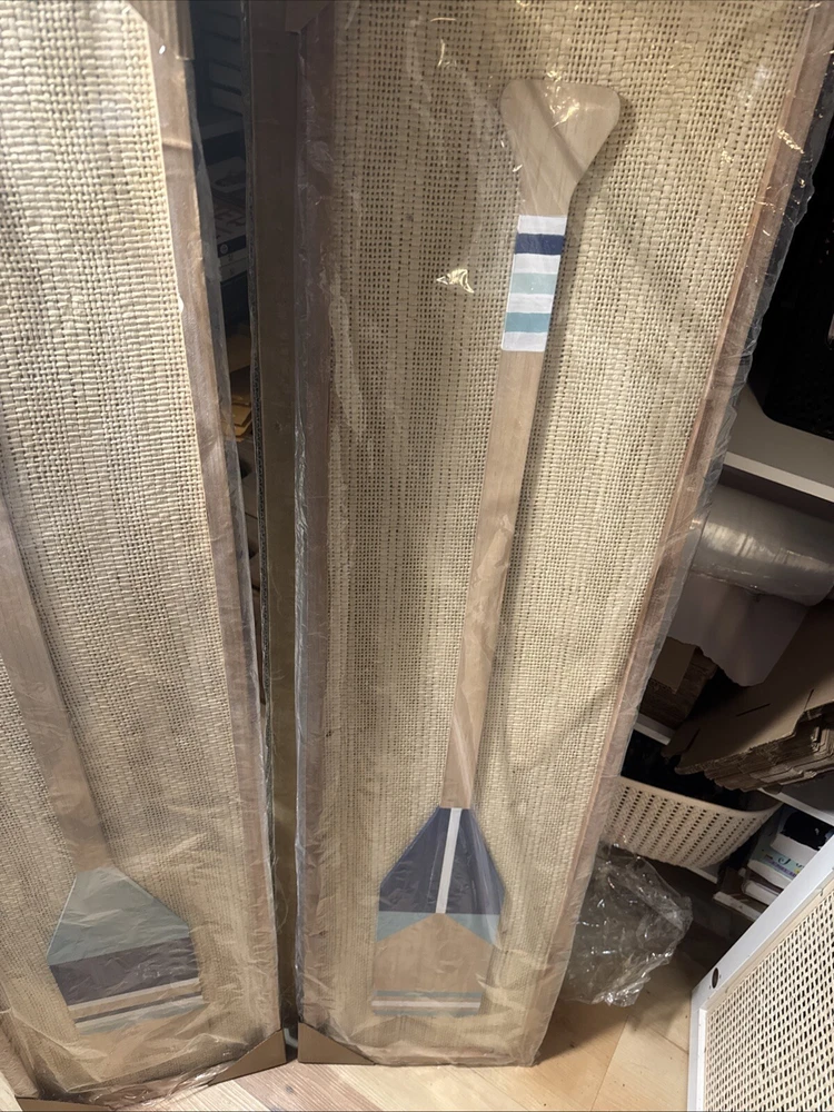Introducing a beautiful set of two decorative paddleboards, perfect for any room in your home with a nautical theme. Crafted from wood with a painted finish, these rectangular boards measure 12 inches in length and 1 inch in width, with a height of 48 inches. The multicolor boards feature a sea life pattern and are adorned with decorative features, making them a perfect addition to your home décor. The paddleboards are suitable for teens, adults, and kids and are great for use in any room. Their style is nautical, and they are the perfect art for those who love the sea life. These boards are not vintage, and you can personalize them to your liking.