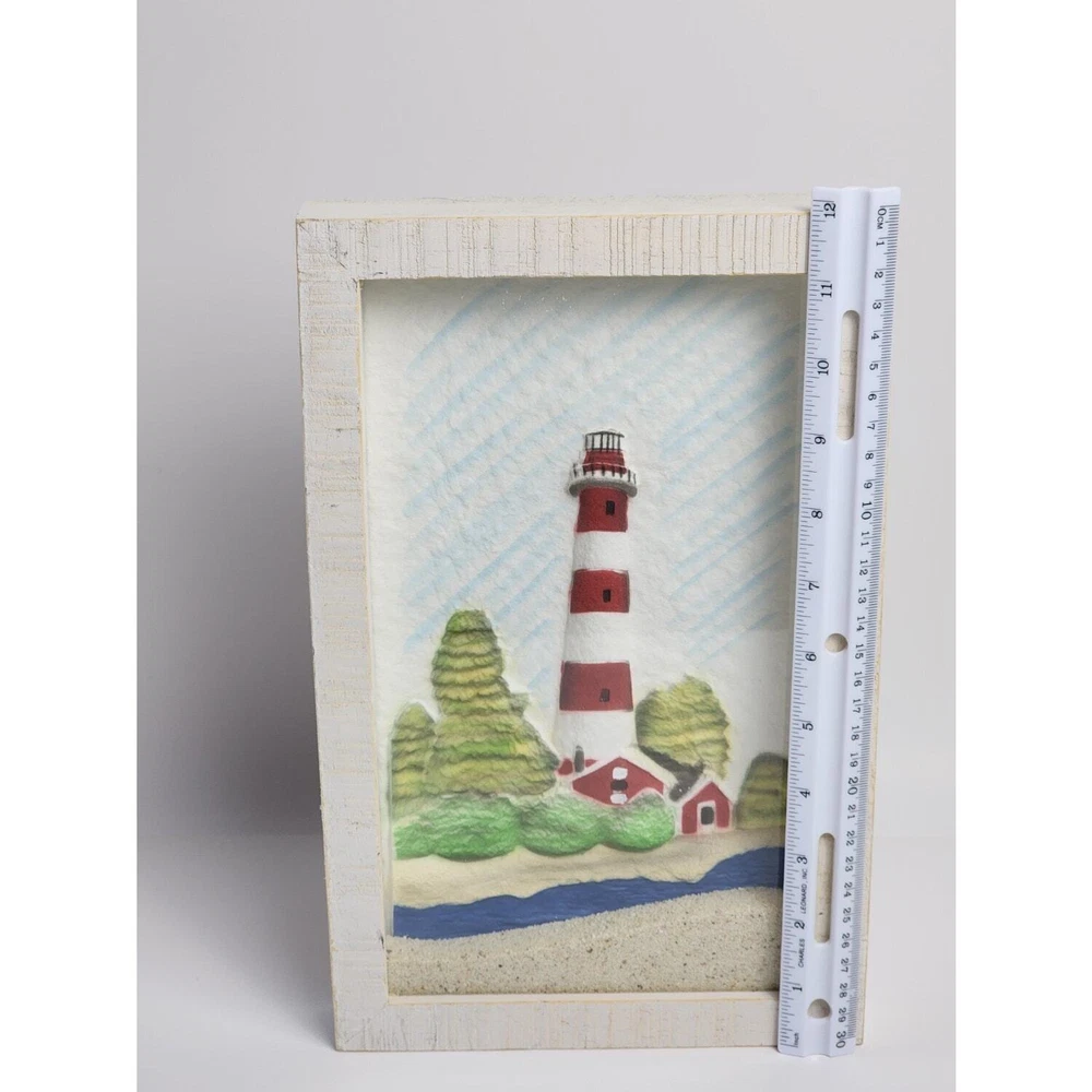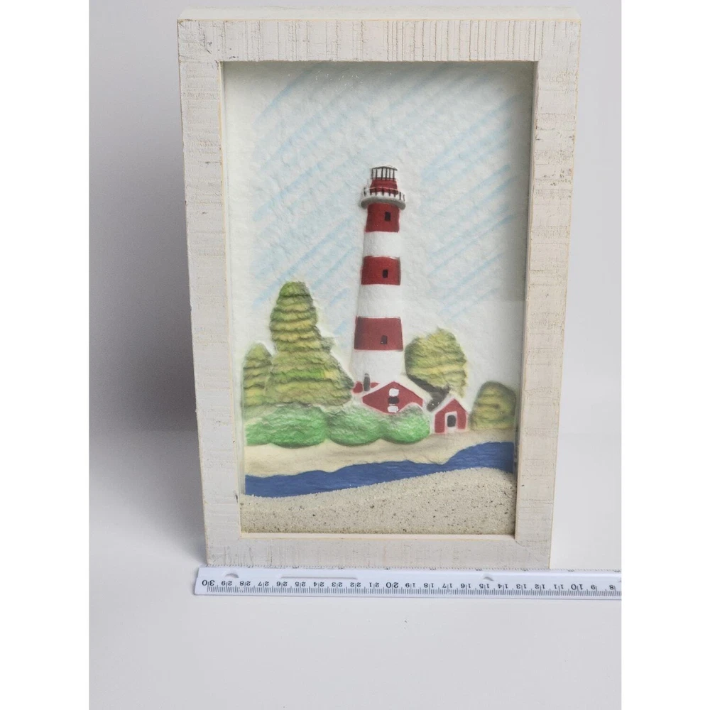 Nautical Themed Framed Picture Shadowbox 3D Lighthouse with Real Sand Décor • Nautical Lighthouse Shadowbox w/ Actual White Sand • Hand Cast Paper Art 3D Intricate Production Technique Used • Involved casting he paper by hand & painting the embossed paper • Framed in a shadowbox with sand for a unique textured look. • A Mixed-Media or Collage Artwork Style • Perfect for any nautical lovers home or office! • Measurements: 12” x 7.5” Pre-Owned / Used: A product that has been used previously. View our listing for full details in our description and check out our photos provided. If there are any imperfections, it will be noted in the description and/or within the provided photos. We appreciate you looking at our listing. Before placing an order, feel free to ask any questions you may have about this item. Upon receiving your order, if you are not satisfied with your order, please contact us and we will address any issue.