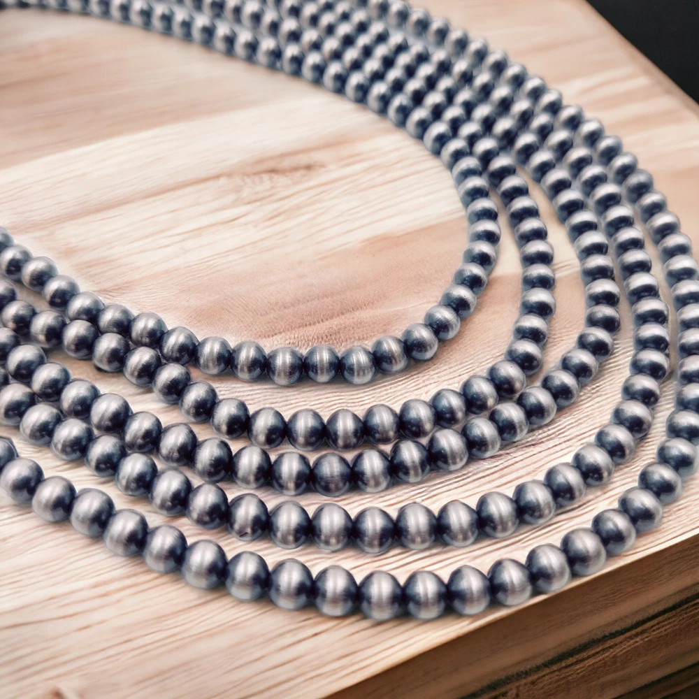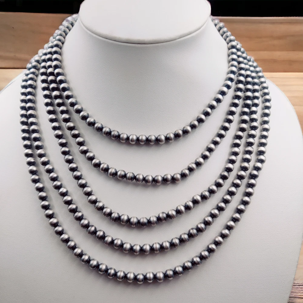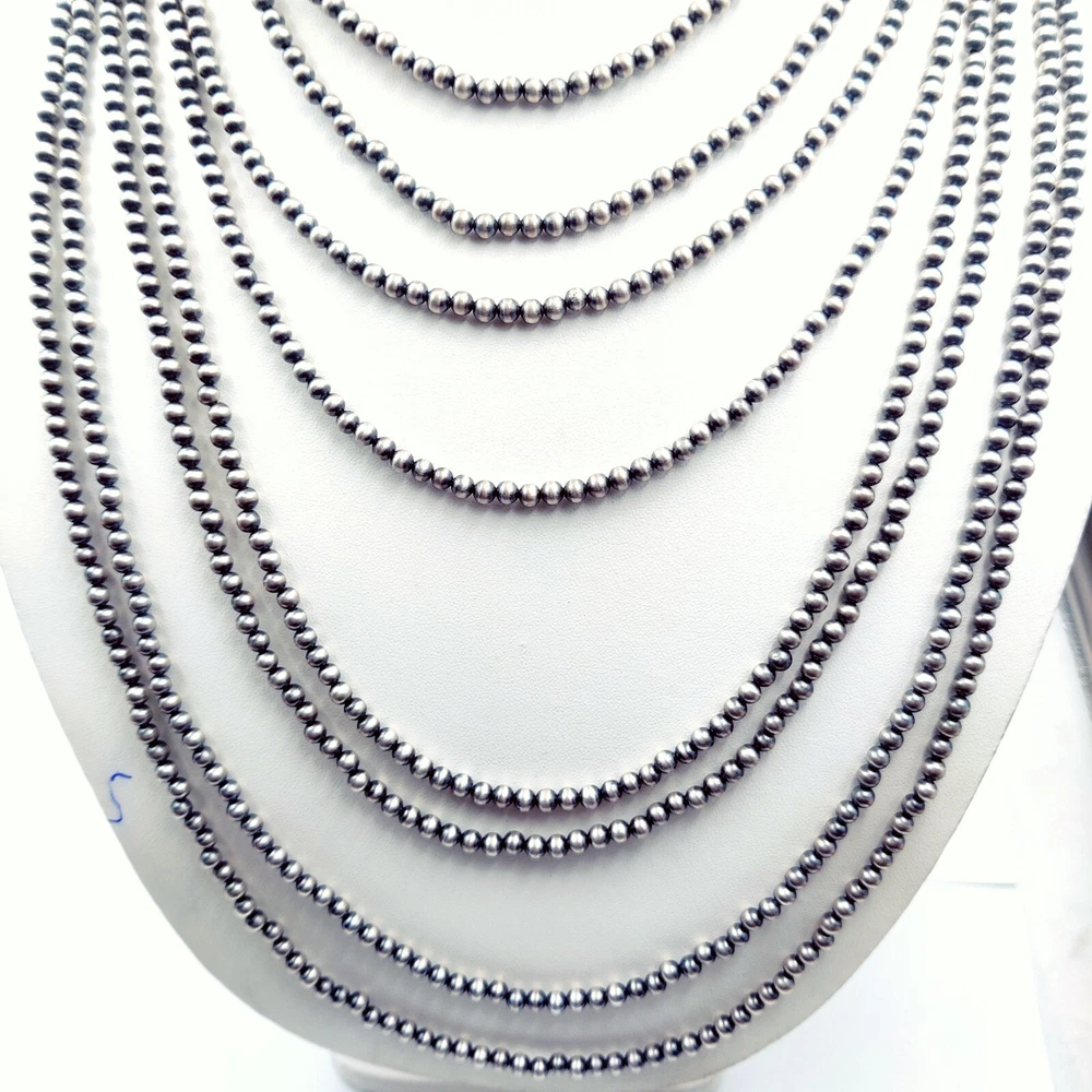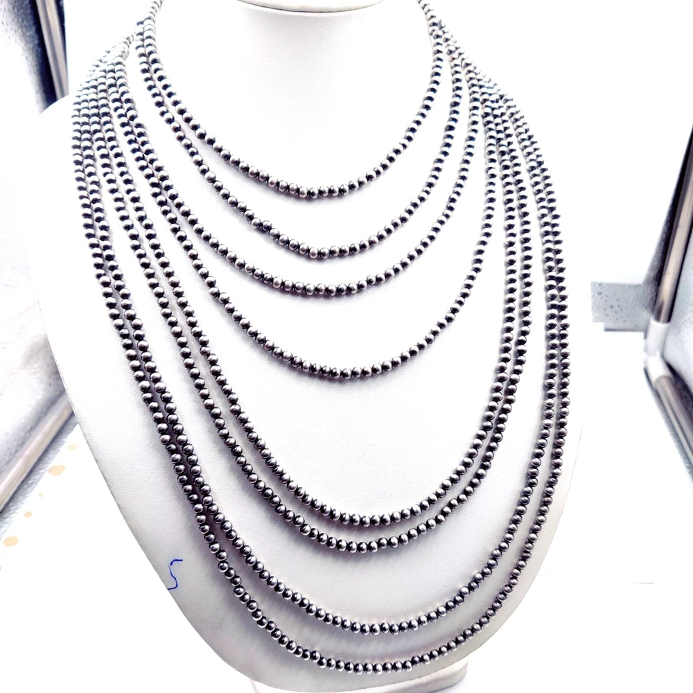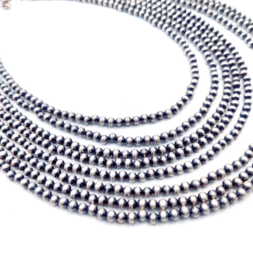 SIZE - 4 MM LENGTH - 14" TO 30" METAL - 925 STERLING SILVER STYLE - NAVAJO DESERT PEARL NECKALCE Simple Southwest! A choker of hand-finished Oxidized 4mm Sterling silver beads. A simple piece of jewelry that layers beautifully with all things Southwest, or they stand alone nicely! Or they can be thrown into any mix. The Sterling silver is oxidized right here in my shop, and necklace is clasped with Lobster clasp, and extender chain which extends choker 2". We understand the true value and nature of handcrafted Indian jewelry. WE ALSO MAKE CUSTUM ORDER ALL SIZE NAVAJO ROUND OR SAUCER BEADS NACKELACE OR BRACLET AND EARRING 4 MM TO 16 MM WE ALSO SELL LOOSE ROUND BEADS OR SAUCER BEADS ON BUYER DEMAND Wholesale orders also accepted at wholesale price. Minimum quantity- 10 pcs EACH SIZE
