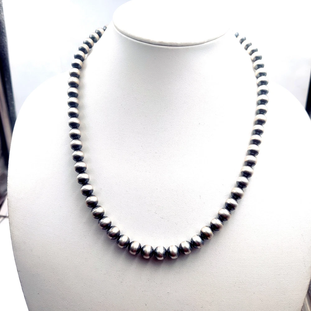 SIZE - 8 MM LENGTH - 14" TO 30" METAL - 925 STERLING SILVER STYLE - NAVAJO DESERT PEARL NECKALCE Simple Southwest! A choker of hand-finished Oxidized 5mm Sterling silver beads. A simple piece of jewelry that layers beautifully with all things Southwest, or they stand alone nicely! Or they can be thrown into any mix. The Sterling silver is oxidized right here in my shop, and necklace is clasped with Lobster clasp, and extender chain which extends choker 2". We understand the true value and nature of handcrafted Indian jewelry. WE ALSO MAKE CUSTUM ORDER ALL SIZE NAVAJO ROUND OR SAUCER BEADS NACKELACE OR BRACLET AND EARRING 4 MM TO 16 MM WE ALSO SELL LOOSE ROUND BEADS OR SAUCER BEADS ON BUYER DEMAND Wholesale orders also accepted at wholesale price. Minimum quantity- 10 pcs EACH SIZE