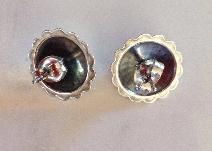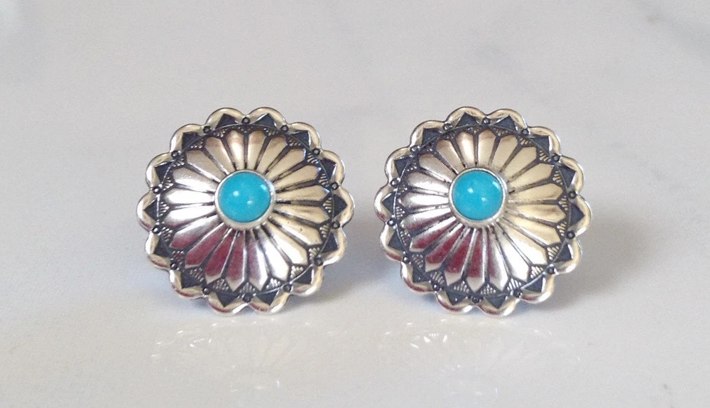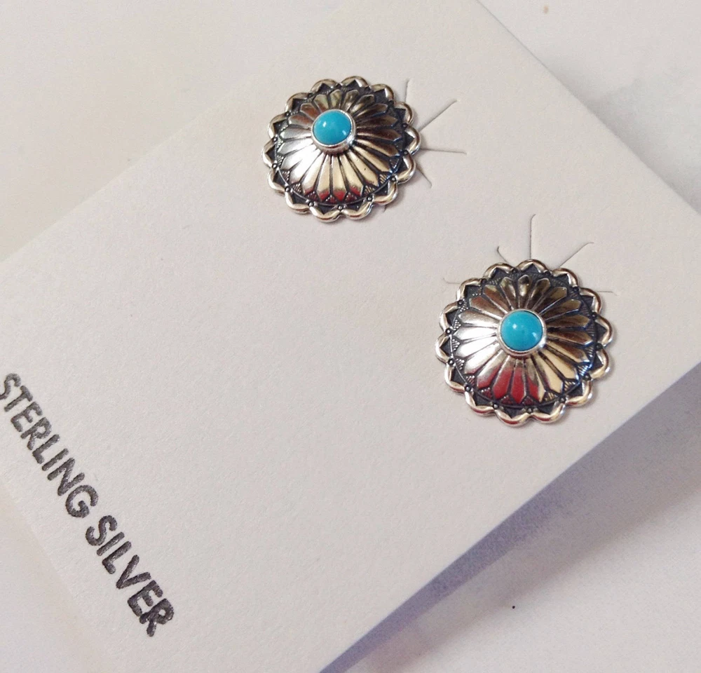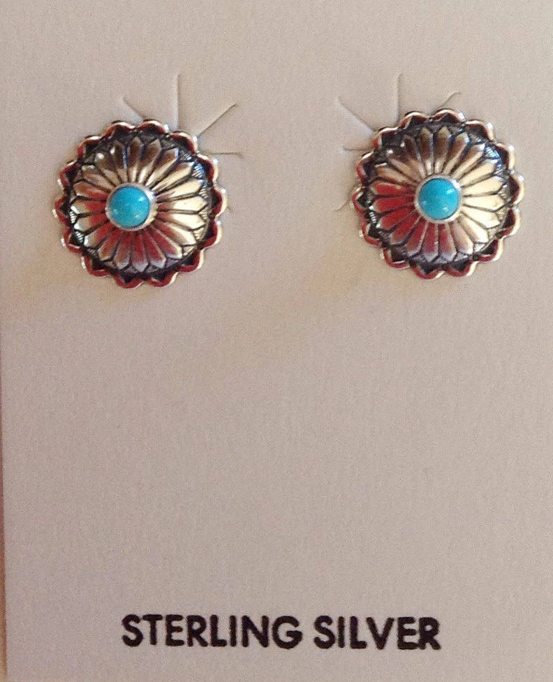 These are very cute Navajo sterling silver and turquoise concho earrings. They were bought in Albuquerque, New Mexico. There is a hand stamped pattern on the earrings. They were made by an unknown Navajo artist. These sterling silver earrings measure just under 1/2 inch in diameter and have a center turquoise bead. The combined weight of these earrings is 1.3 grams for all day comfort. These earrings are in excellent condition - great concho style earrings. A gift box is included with purchase.