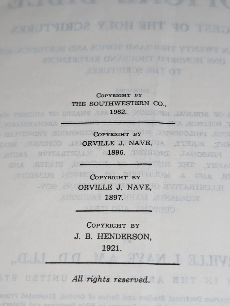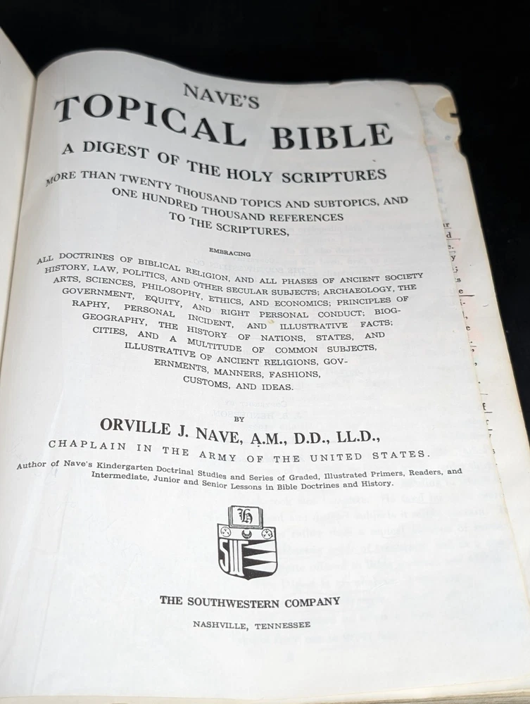 Discover the ultimate reference tool for your spiritual journey with Nave's Topical Bible Digest of Holy Scriptures. This leather-bound book is a comprehensive guide to the Bible, with a wealth of information on religion and spirituality. The book covers a range of topics, from the history of the Bible to the interpretation of its teachings, making it an essential resource for adults of all ages. The faux leather bound book has a thumb index and was published by Southwestern in 1962. It is written in English and belongs to the religious and spiritual genre. With its clear language and easy-to-use format, Nave's Topical Bible is the perfect tool for anyone seeking to deepen their understanding of the Bible. This Bible study tool was well loved and used see photos for condition.