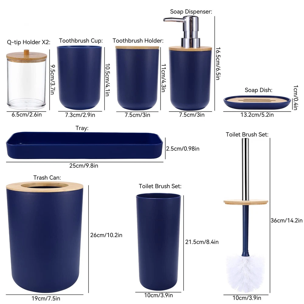 SLDIYWOW Blue Bathroom Accessories, 9-Piece Navy Blue Bathroom Accessories with Trash Can,Tray,Soap Dispenser,Toothbrush Holder,Toothbrush Cup,Soap Dish,Toilet Brush and Q-tip Holders for Bathroom 【Navy Blue Bathroom Accessories Sets Complete】9 pieces navy blue bathroom set includes 1 x soap dispenser, 1 x toothbrush holder, 1 x toothbrush cup, 1 x soap dish, 1 x trash can, 1 x toilet brush set, 1 x vanity tray and 2 x qtip holders. Having most of the items you need for your bathroom will make your bathroom more eye-catching. 【Durable and Amazing High Quality】Our dark blue bathroom accessories is made of high-quality PP and ABS material, which is not easy to break, more durable and long-lasting, outperforms glass, ceramic, resin, wooden bathroom sets. Premium plastic blue bathroom sets are durable and they will stay elegant and new over time. 【Fully Functional Completed Set】Hollow trash can makes it easier for you to throw away garbage. Double-layer hollow design soap dish can keep soap dry. Q-tip holders can put qtips, cotton balls, flossers, bath salts, hair bands or any other bathroom necessities and accessories. Soap dispenser, toothbrush cup, and toothbrush holder are the perfect complement for the bathroom. Bathroom accessories are the perfect addition to your bathroom home-style makeover. 【Easy to Clean & Stay Tidy】This navy blue bathroom accessories set with trash can is designed with ease of cleaning in mind, avoiding excessive grooves and hard-to-reach corners. Its smooth surface and simple line make the cleaning easier. Just wash with soapy water and a soft cloth to make your bathroom look like new again. It not only saves your precious time, but also meets the requirements of modern life. Convenient and simple concepts make you to enjoy a more comfortable and relaxed life. 【Widely Application】Bathroom set perfect for bathroom decors, dorm, hotel, apartment, laundry room, basement, RV, etc.Perfect for wedding,housewarming/new home gift,birthday gift, mother’s day gift , valentine’s day gift,thanksgiving gift,Christmas gift,bridal or baby shower gifts,friend, sister, co-worker or just about anyone to use all year round. SHIPPING Domestic Buyers - We have confidence in our products, but if you are not fully satisfied please contact us within 30 days of purchase and you will get full refund. - We ship within 3 business days of payment, usually sooner - We offer FREE shipping on all orders! - We only ship to the lower 48 states, no APO/FPO addresses or PO Boxes allowed International buyers – please note: Import duties, taxes, and charges aren't included in the item price or postage cost. These charges are the buyer's responsibility. - Please check with your country's customs office to determine what these additional costs will be prior to bidding or buying. * Order Cancellation Policy ** You can return a product for up to 30 days from the date you purchased it. 1. The seller reserves the right to cancel the special case only due to eBay cancellation fee. 2. The decision of seller is the final. 3. The seller will respond to the cancellation request within 2 business days. Please wait for the result of cancellation. 4. In case the cancellation is not completed by some reasons, the buyer can follow the options below to get the refund. 4.1 The buyer can reject the item when it arrives. 4.2 The buyer can send the item back to the seller within 30 days If the buyer receives item (USA Shipment ONLY). The seller will provide the FREE return label to the buyer when the buyer opens " Return Item" case on eBay by using the reason as "Change my mind" ONLY. 5. When buyer has placed the order. The order will be processed and completed by automatic warehouse system within 5 minutes. In case that buyer sends the cancellation request after 5 minutes of placing the order, the request will be rejected. **Sending direct message to cancel the order is not allowed for every case.* Return Policy For the return case - If buyer would like to return the items for refund or replacement, please CONTACT SELLER to receive the free return label from seller. The refund or replacement will be processed with the tracking number of return label which is provided by seller only. The other ways of return which are not approved by seller will not be processed for the refund or replacement.