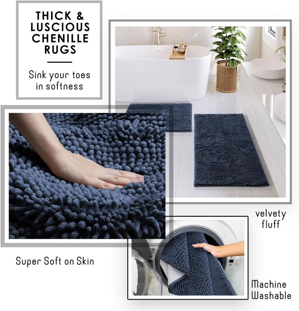 Bathroom Accessories Set - Navy Bathroom Set, Bathroom Sets with Shower Curtain and Rugs, 22PC Shower Curtain Set with Bathroom Trash Can 100% Polyester Navy Blue Bathroom Accessories Set: Update your bathroom set with Navy Blue bathroom decor, creating a stylish haven with a Navy Blue bathroom rug set and bamboo bathroom accessory set. Bathroom Sets with Shower Curtain and Rugs: Includes 2 bathroom rugs, toothbrush holder, tumbler, soap dispenser, soap dish, bathroom trash can, toilet brush and holder set, 12 shower curtain hooks, and fabric shower curtain set with clear shower curtain liner. Boho Shower Curtain with Shower Liner: Shower curtain with hooks includes a clear shower curtain liner with weighted magnets at the bottom to keep it in place, and 12 rust-resistant shower curtain rings. Navy Blue Shower Curtain: Shower curtains for bathroom measure 72” x 72”; made of durable, wrinkle-resistant polyester with a waffle texture, and reinforced hook holes. 2 Bath Mats for Bathroom, Non Slip: Each chenille bath rug is super soft and highly absorbent, with non-skid backing. Navy Blue bathroom rug set: Small 17”x24”; Large 20”x32”.