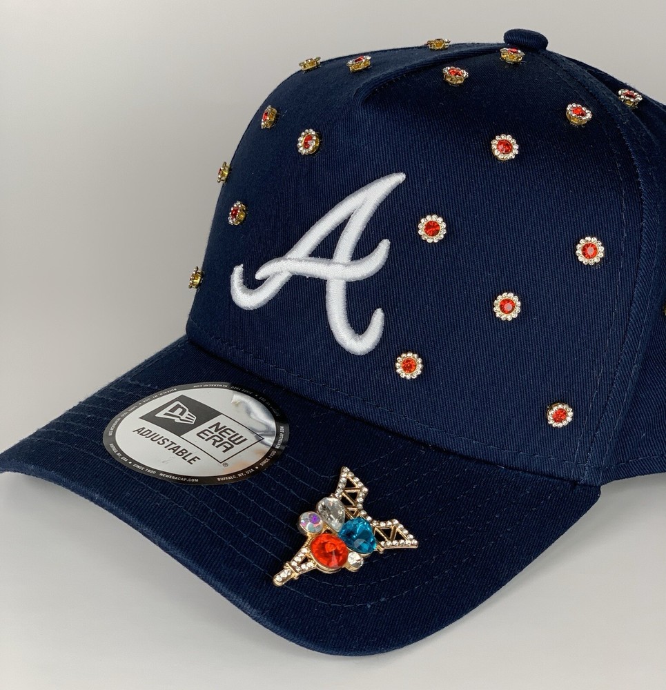 This is a navy blue baseball cap with red bling and Atlanta Braves embroidery. It is a custom New Era cap made in the United States with acrylic, polyester, and wool materials. The cap is fitted and has a solid pattern. It is suitable for travel, weddings, parties, casual and formal occasions, workwear, and business events. The cap is available in one size and can be personalized. The personalization instructions are to handle with care. The cap is handmade and has a 90s theme.