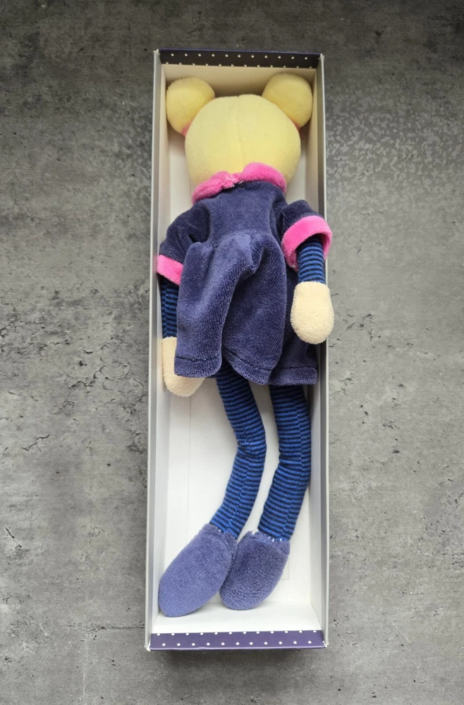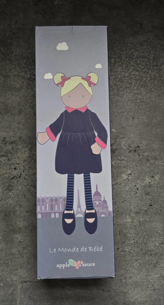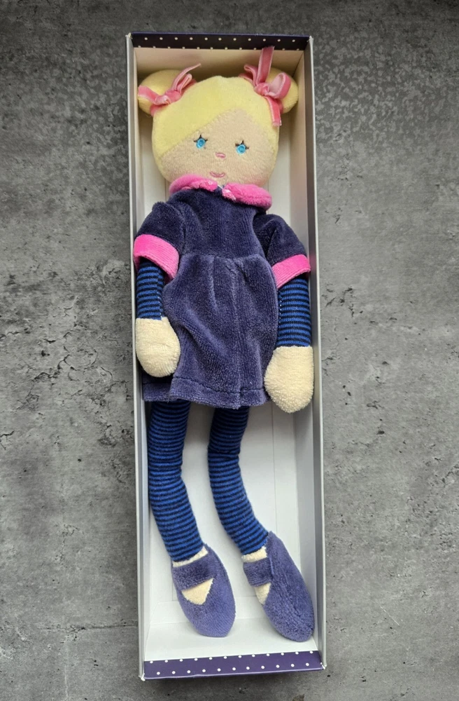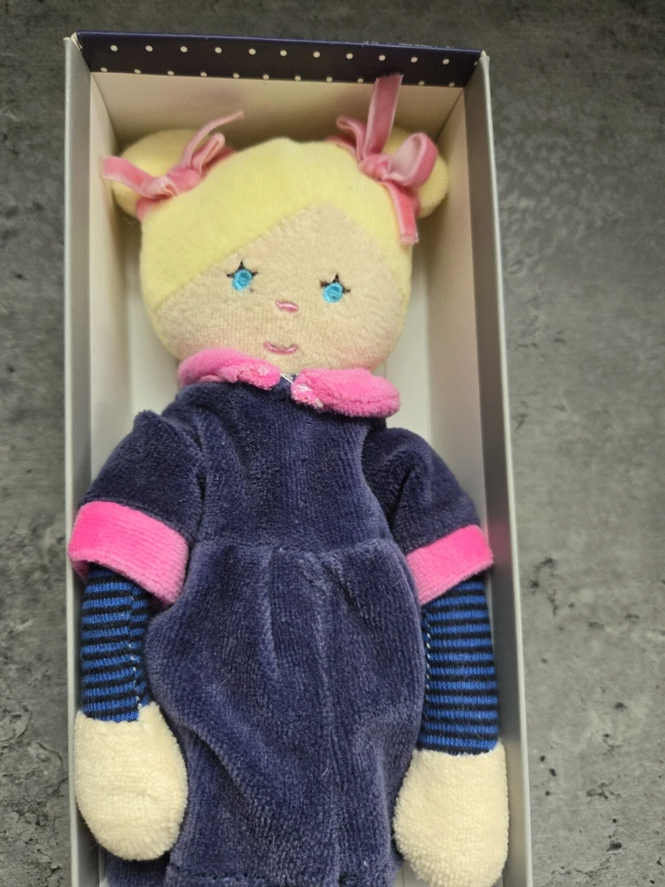 Navy French Baby Doll by Applesauce Soft Plush Rag Doll Lovey Blonde Blue Eyes Gently loved from a pet free, smoke free home.
