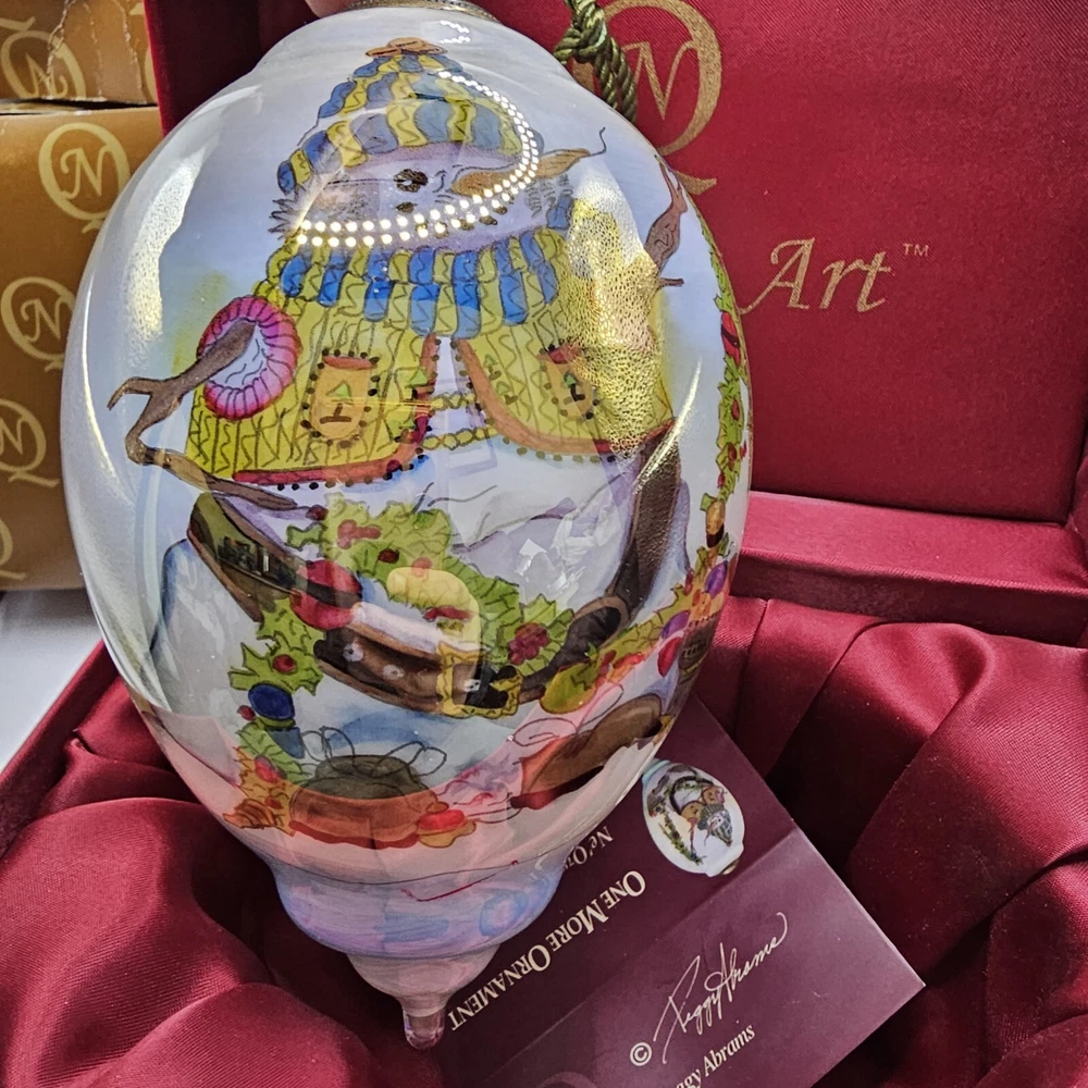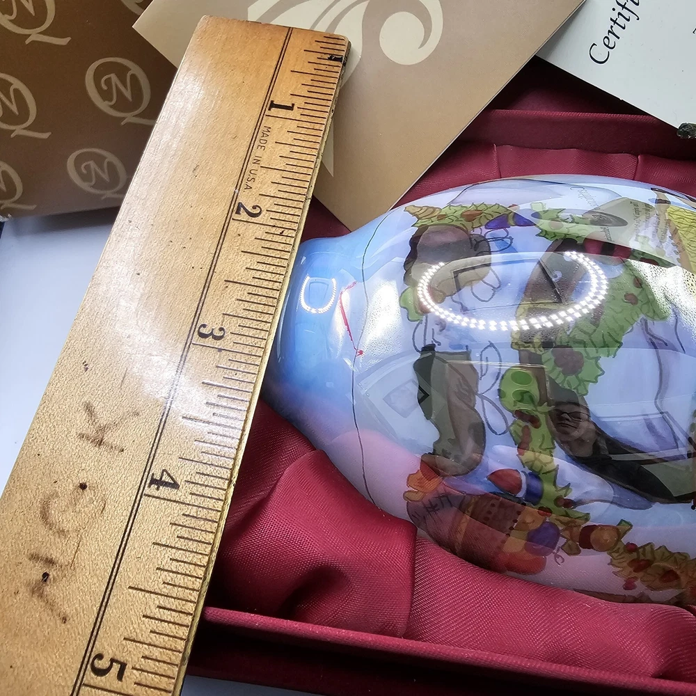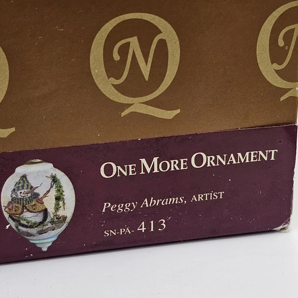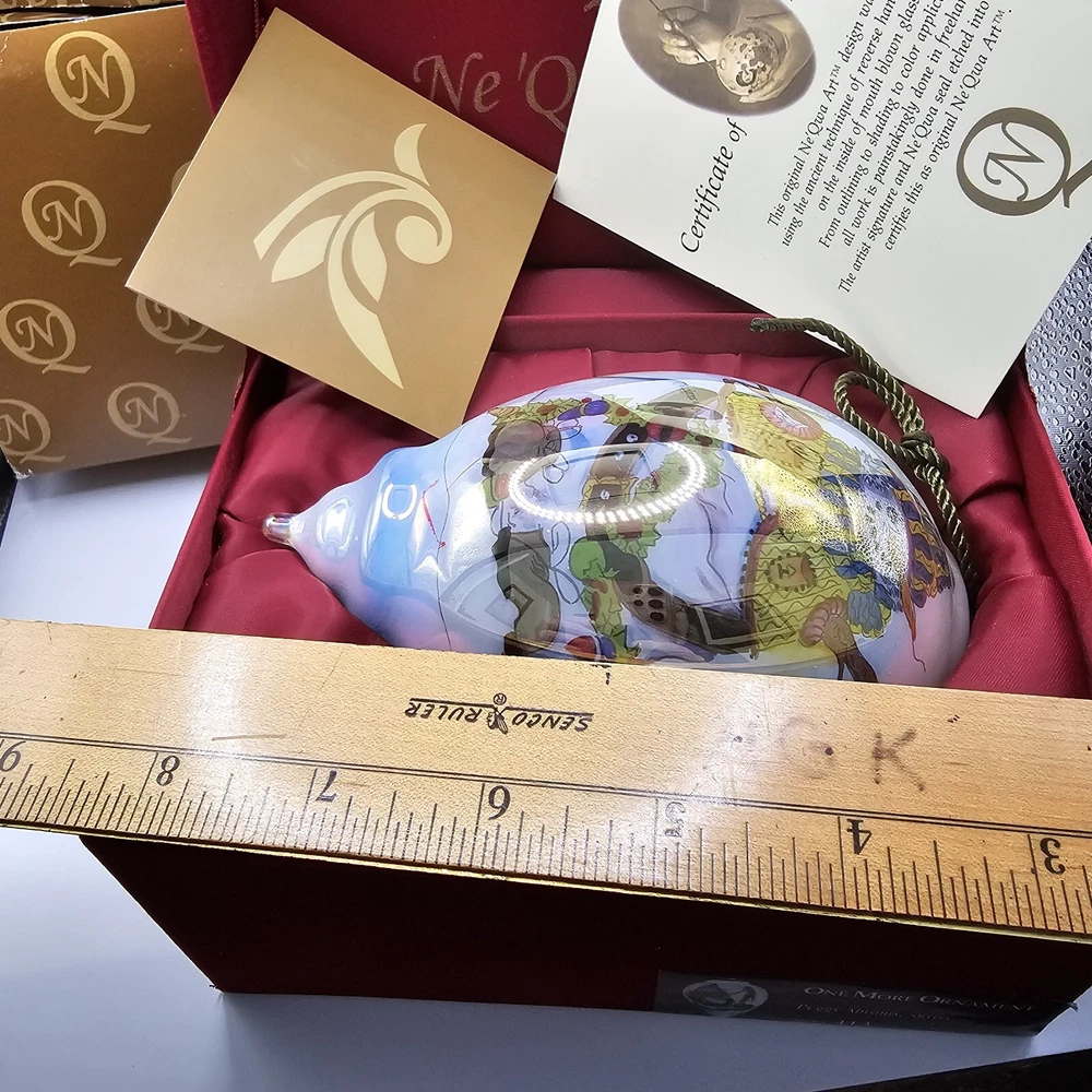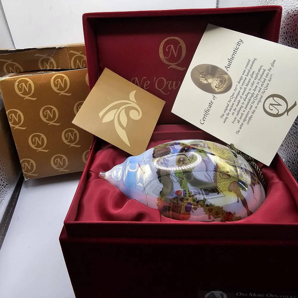 The Ne'Qwa Art Christmas Snowman Ornament by Peggy Abrams is a large hanging finial ornament made of blown glass. It features an Old World Santa and snowman theme, with a unique reverse hand-painting style. This ornament is part of the Ornaments collection and is signed by the artist. It is 6 inches in height and handmade, making it a beautiful and collectible piece for Christmas decorations. Comes in original box, certification of authenticity paperwork. Wear to outside box. Sold as is