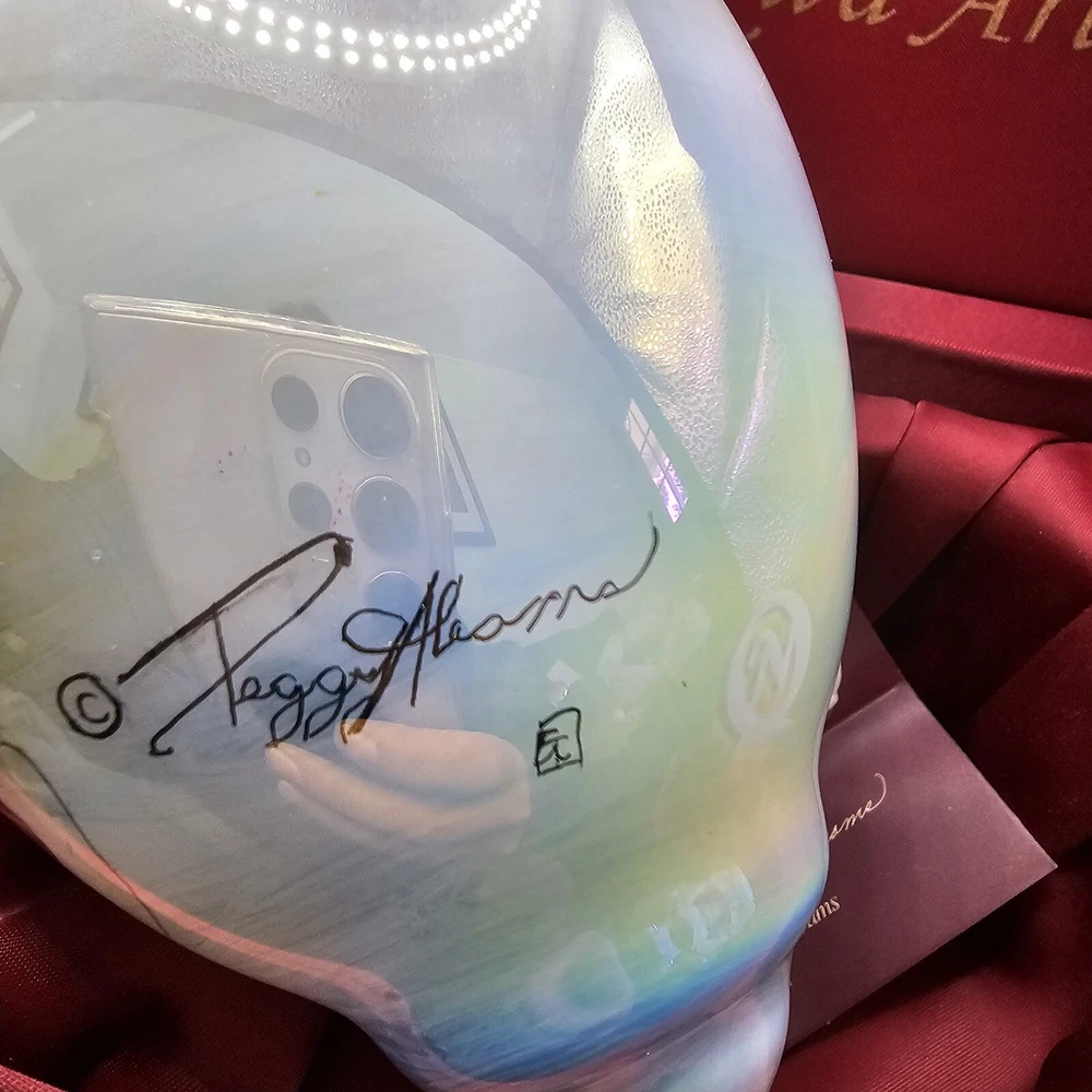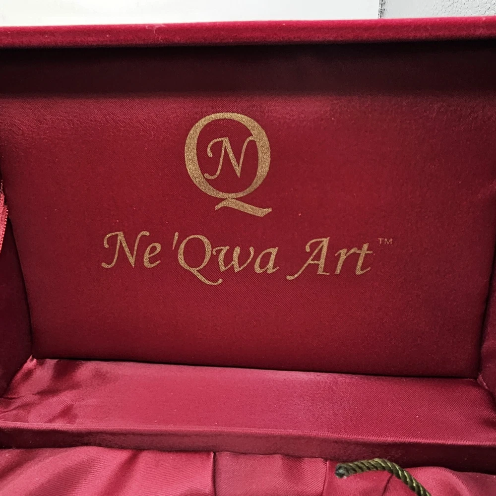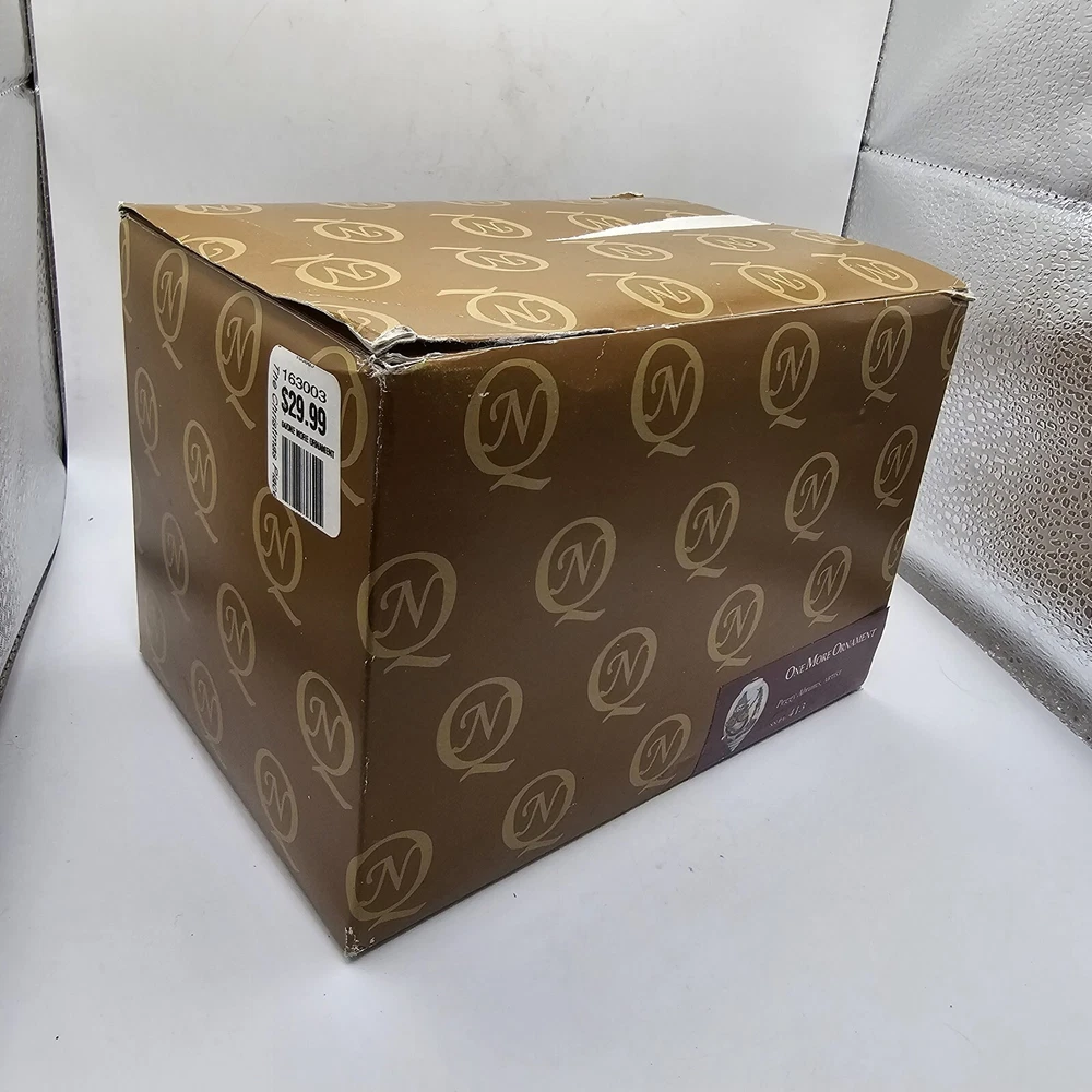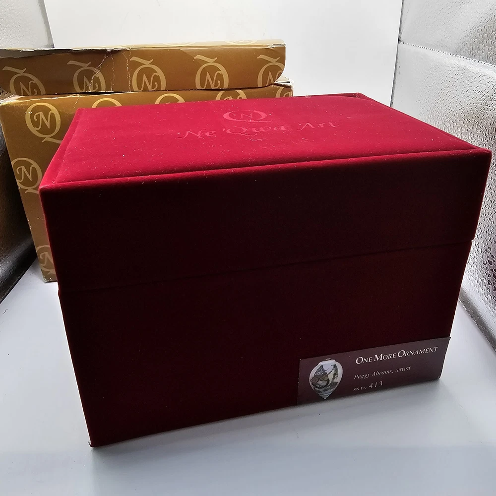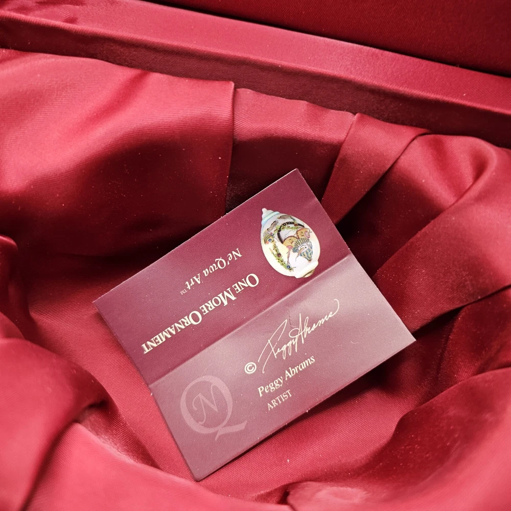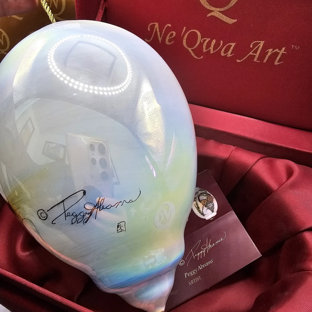 The Ne'Qwa Art Christmas Snowman Ornament by Peggy Abrams is a large hanging finial ornament made of blown glass. It features an Old World Santa and snowman theme, with a unique reverse hand-painting style. This ornament is part of the Ornaments collection and is signed by the artist. It is 6 inches in height and handmade, making it a beautiful and collectible piece for Christmas decorations. Comes in original box, certification of authenticity paperwork. Wear to outside box. Sold as is
