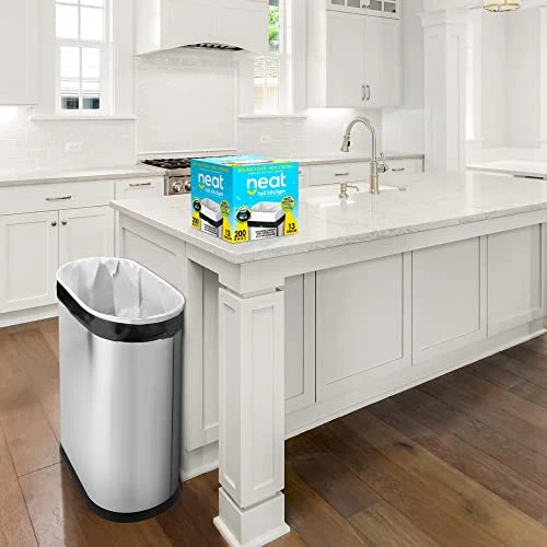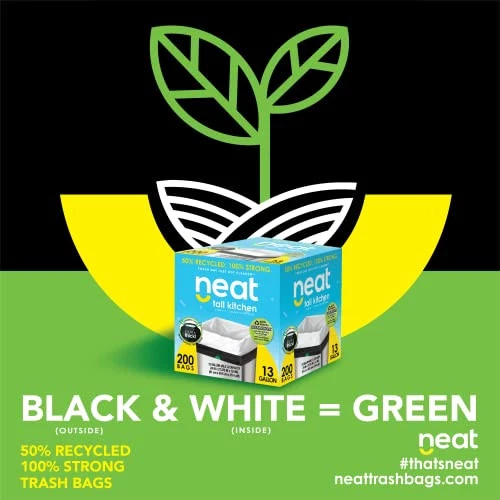 Neat Tall Kitchen 13 Gallon Drawstring Trash Bags - (MEGA 200 COUNT) - Triple Ply Fortified, Eco-Friendly 50% Recycled Material, Neutralize+ Odor Technology, Reversible Black and White Garbage Bags 100% Frustration Free - Neat 13 Gallon trash bags are triply ply fortified using Harmonyx advanced film technology. Resistant to puncture, tears, and leaks, we just made trash day a whole lot smarter. Help the Environment - Our bags use 50% recycled material helping to decrease landfill waste. Feel good knowing you are helping to decrease your carbon footprint vs leading brands. Reversible Black and White Bags - The inside of the bag is white to give a clean, pure look to your kitchen. The outside of the bag is black to conceal what's inside when it's time to take it out. Grips the Can Every Time - Our Firm Fit drawstrings snuggly grip any 13 gallon can without ripping. Easy on and easy off.
