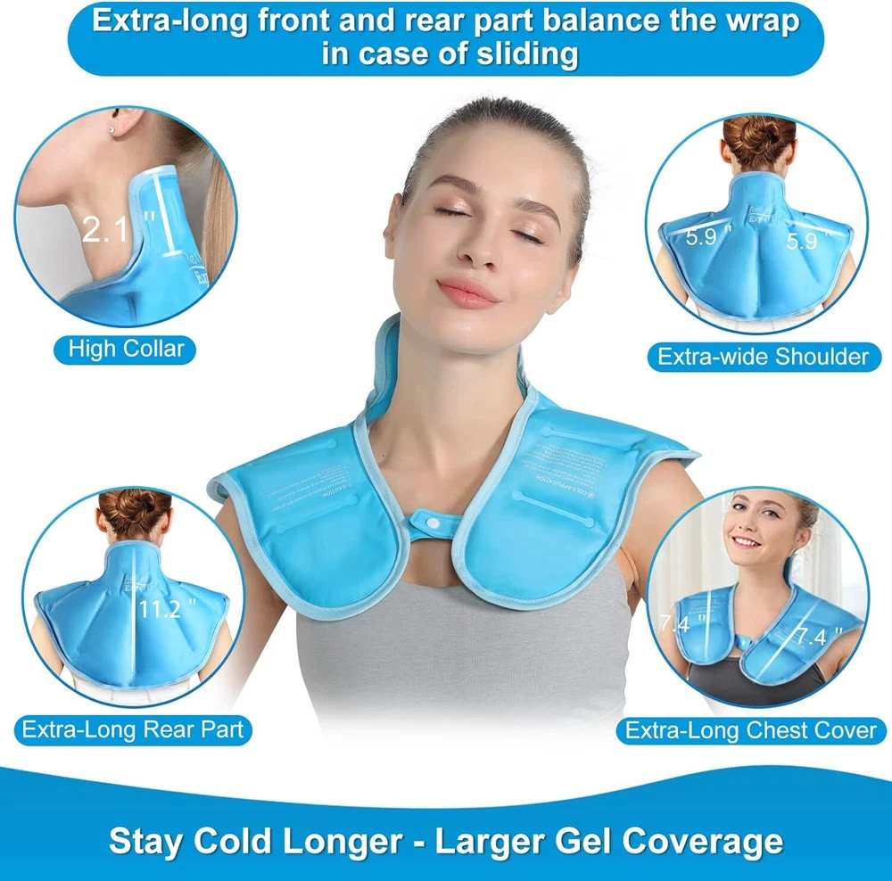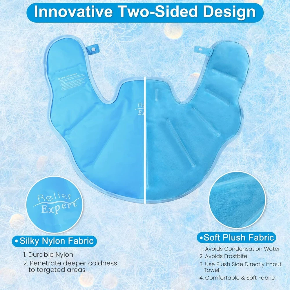 Innovative & Two-sided Design- The Relief Expert shoulder ice pack wrap adopts dual-fabric. One side is soft plush fabric that is available to use straight to skin, stays cold without condensation and prevents cold injuries. The other is nylon fabric, penetrating deeper coldness to targeted areas if the plush side isn't quite cold enough. Large Gel Coverage & Prevent Gel Leakage- The neck ice pack wrap is filled with 30% thicker gel than others, providing full and deeper coldness for neck and shoulders. Double-seam technology prevents gel leakage. Excellent quality of gel ice pack for neck and shoulders enables reuse frequently. Keep Flexible & Stay Cold Longer- Unlike other similar products, our ice pack for neck has lower freezing point(-13°F), which keeps flexible and soft even after freezing long time. Relief Expert ice pack for shoulders' cold-lasting time is longer than others as well, easy to enjoy soothing relief and snug fit shoulder ice pack. Effective Pain Relief- The ice pack shoulder helps reduce bruises, relieve sports injuries, arthritics, swelling and chronic joint pains. Portable to Use - When chill the ice neck wrap in freezer, place the neck and shoulder ice pack in the durable bag to protect the neck shoulder cold pack from stain and odor in freezer, or portable to take away for outside activities. Product Description More Relief Expert Ideal Choices Add to Cart Add to Cart Add to Cart Customer Reviews 4.3 out of 5 stars 3,550 4.7 out of 5 stars 1,838 4.3 out of 5 stars 2,545 4.0 out of 5 stars 27 4.4 out of 5 stars 18 4.9 out of 5 stars 37 4.7 out of 5 stars 22 Price $21.99 $ 21 . 99 $19.54 $ 19 . 54 $16.99 $ 16 . 99 $18.99 $ 18 . 99 $29.99 $ 29 . 99 $18.99 $ 18 . 99 $18.69 $ 18 . 69 Targeted Pain Relief Neck, Shoulder Shoulder, Back Shoulder Neck Neck Ankle, Foot, Plantar Calf, Shin Material Plush side and Nylon side Plush side and Nylon side Plush side and Nylon side ABS&TPR Pliable Lycra and Mesh Fabric Copper Ion Fabric & Terry Copper Ion Fabric & Terry Filler of inside Gel Gel Gel - Gel Gel Gel Therapy Type Cold Cold Cold - Cold Cold Cold Pliable ✔ ✔ ✔ ✔ ✔ ✔ ✔