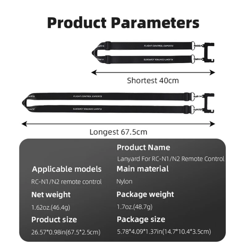 Neck Strap Lanyard Shoulder Belt Hanging Rope for 3/4 Remote Control Features: During flight photography or batteries replacement, hands can be released to effectively and safely protect the remote control. nylon material, lightweight, good breathability, and not easy to break. Stainless steel metal buckle, sturdy and durable. The fabric is soft and smooth, making it comfortable to wear. Length can be adjusted within ranges of 40-67.5cm/37-64cm, suitable for people of different heights. Specifications: Nylon Color: Black Type: RCN1/RCN2, RCRC2 RCPro(optional) For RCN1/RCN2 Remote: Approx. Fold Length 40-67.5cm/15.7-26.5", Width 2.5cm/0.98" For RCRC2 RCPro Remote: Fold Length 37-64cm/14.5-25.4", Width 2.5cm/0.98" Applicable Model: for 3/4 Drones, for RCN1/RCN2 or for RCRC2 RCPro Remote Control Package Includes: 1x Remote Control Strap note: Please allow 1-2cm errors due to manual measurement. Please allow for slight color differences due to different display resolution.