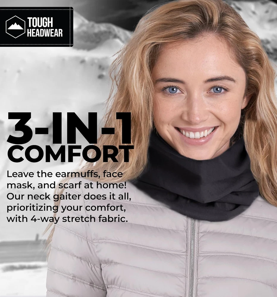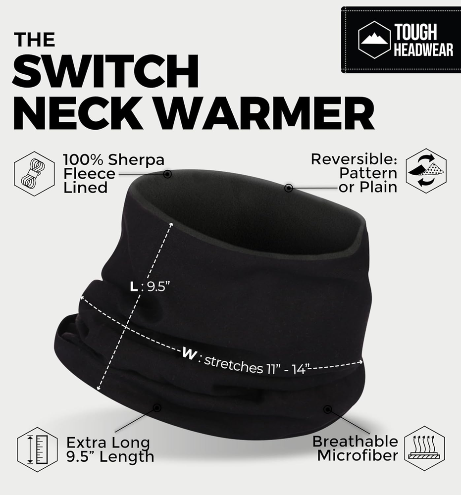 Product Description Tough Headwear Switch Neck Warmer Staying warm in the winter is no easy task — and looking good with the wind, snow, and frigid air whipping at your face? Well, that’s next to impossible. But you shouldn’t have to compromise your personal style to protect yourself from the bitter elements this winter — so it’s time to get a neck warmer that can do both. Our neck gaiter winter is reversible — choose one with a bold pattern or pop of color of your choice on one side, then flip it to the other side for a classic black polar fleece layer that looks sleek with everything you wear. You’ll look your best and feel your warmest whether you’re hitting the slopes, going out to walk the dog, taking your bike out for a spin, or just need a face mask when you’re running into stores and taking public transportation. Two layers of tech fabric work together to keep the cold out and the coziness in. The inner layer of ToughTech polar fleece locks in the heat while a second smooth microfiber layer wicks away moisture. Our neck warmer gaiter is soft, breathable, lightweight, and has four-way stretch for a fit that’s snug but comfortable. Wear it as an ear warming headband, face mask, or neck cover or fleece neck cover— wind, sleet, snow, and cold air don’t stand a chance. Switch between soft, warm fleece on one side or a lighter, equally warm microfiber on the other. Our winter neck gaiters for men and women is versatile, lightweight, and has four-way stretch, so it will fit comfortably and stay put While it is incredibly warm, our neck warmer men and women love is deceptively lightweight and breathable. Our reversible winter neck warmer features four way stretch so that it fits snugly over most head sizes and shapes, while staying in place. Tough Headwear Solid Neck Warmer Add to Cart Add to Cart Add to Cart Add to Cart Customer Reviews 4.4 out of 5 stars 9,757 4.4 out of 5 stars 9,757 4.4 out of 5 stars 9,757 4.4 out of 5 stars 9,757 Price $5.95 $ 5 . 95 $5.95 $ 5 . 95 $5.95 $ 5 . 95 $5.95 $ 5 . 95 Series Thermal Winter Gear Thermal Winter Gear Thermal Winter Gear Thermal Winter Gear Designed For Ski,Snowboarding,Motorcycling Ski,Snowboarding,Motorcycling Ski,Snowboarding,Motorcycling Ski,Snowboarding,Motorcycling Features Soft,Thick,Stretchy,Reversible Soft,Thick,Stretchy,Reversible Soft,Thick,Stretchy,Reversible Soft,Thick,Stretchy,Reversible Colors/Designs 15 Colors/Designs 15 Colors/Designs 15 Colors/Designs 15 Colors/Designs Material 94%Polyester 6%Spandex 94%Polyester 6%Spandex 94%Polyester 6%Spandex 94%Polyester 6%Spandex Tough Headwear Fleece Neck Warmer Add to Cart Add to Cart Add to Cart Add to Cart Customer Reviews 4.4 out of 5 stars 3,181 4.4 out of 5 stars 3,181 4.4 out of 5 stars 3,181 4.4 out of 5 stars 3,181 Price $8.95 $ 8 . 95 $8.95 $ 8 . 95 $8.95 $ 8 . 95 $10.95 $ 10 . 95 Series Thermal Winter Gear Thermal Winter Gear Thermal Winter Gear Thermal Winter Gear Designed For Ski,Snowboarding,Motorcycling Ski,Snowboarding,Motorcycling Ski,Snowboarding,Motorcycling Ski,Snowboarding,Motorcycling Features Soft, Thick, Warm & Stretchy Soft, Thick, Warm & Stretchy Soft, Thick, Warm & Stretchy Soft, Thick, Warm & Stretchy Colors/Designs 5 Colors/Designs 5 Colors/Designs 5 Colors/Designs 5 Colors/Designs Material 100% polyester 100% polyester 100% polyester 100% polyester